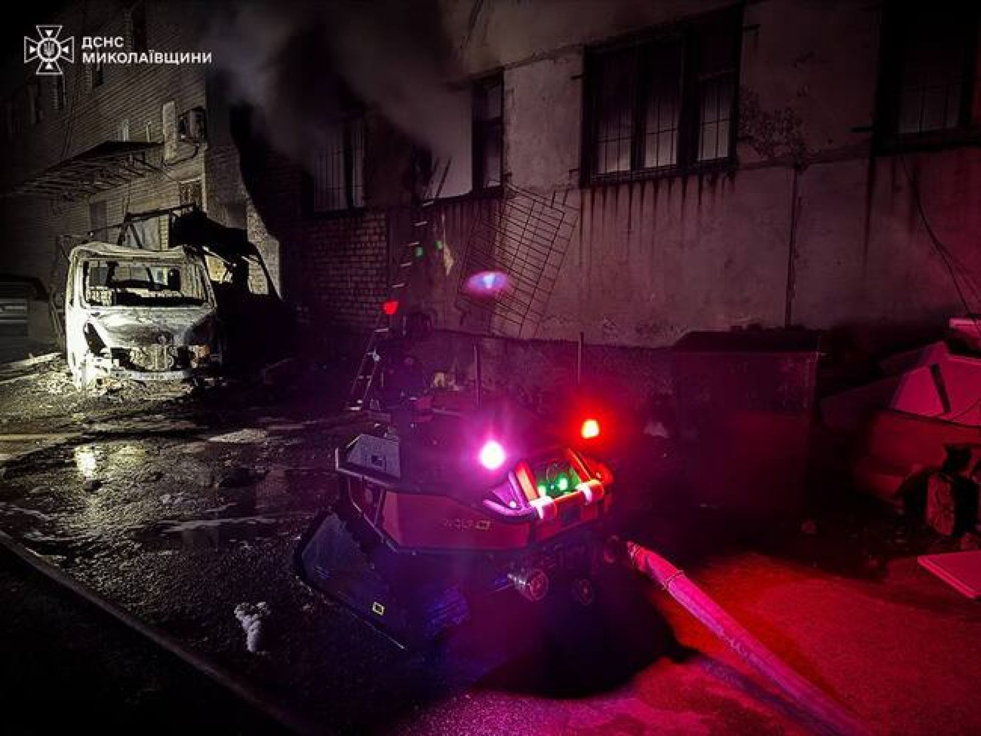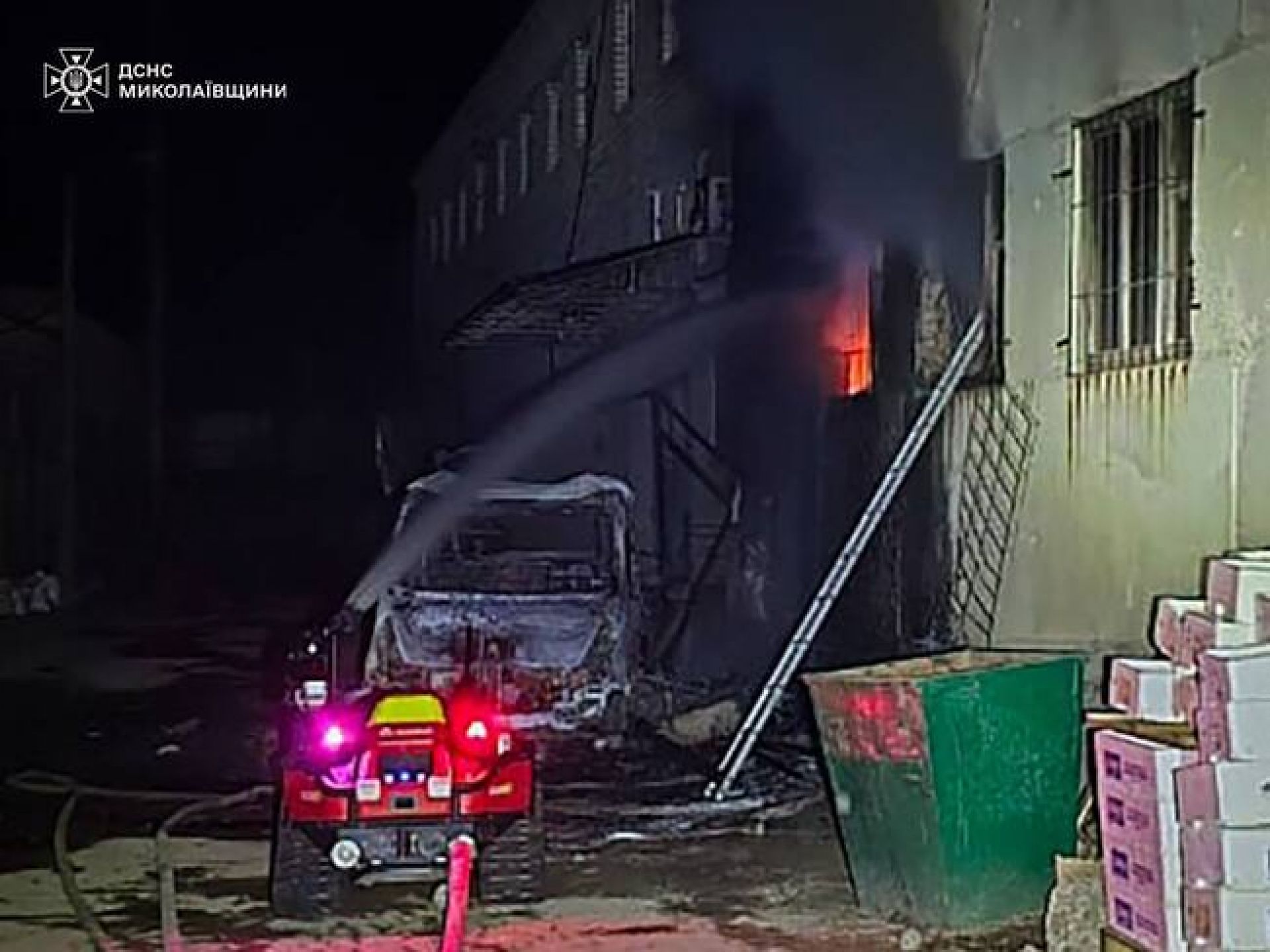 Миколаївська область: Через падіння уламків безпілотника в Миколаєві загорілося складське приміщення та вантажний фургон. ДСНС ліквідували пожежу на 20 квадратних метрах, не допустивши поширення вогню. Задіяли 24 рятувальники, 7 спецавтомобілів та тактичний робот Magirus Wolf R1. Постраждалих немає.