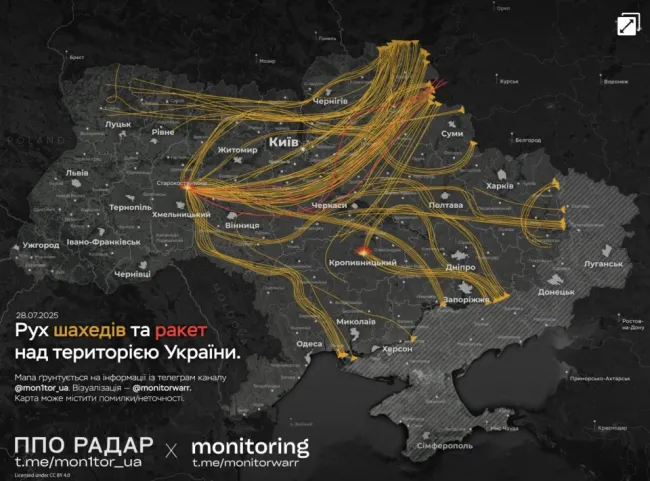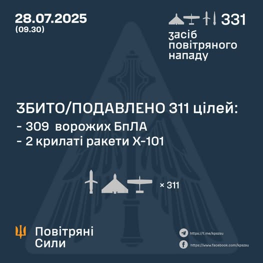- Починаючи з вечора 27 липня, росіяни здійснили масштабний повітряний напад — загалом випустили 331 повітряний засіб. За даними Повітряних сил, основний удар спрямували на Хмельницьку область, зокрема Старокостянтинів.