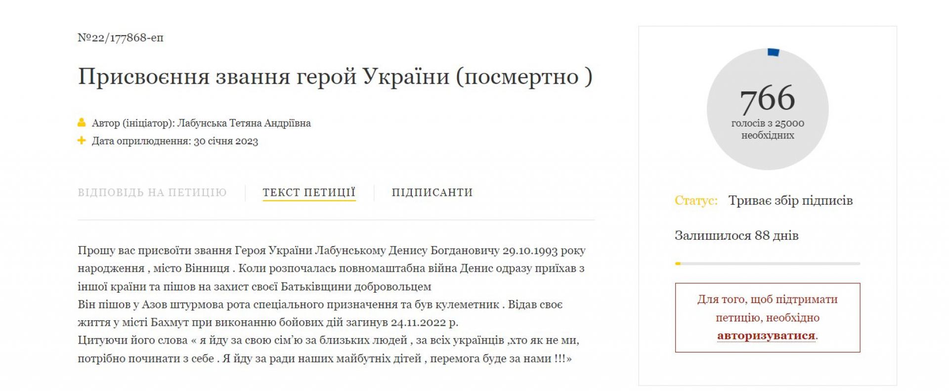 Дружина загиблого Тетяна просить Президента України присвоїти звання Героя України Лабунському Денису Богдановичу. Відповідне звернення вона виклала на сайті офіційного представництва.