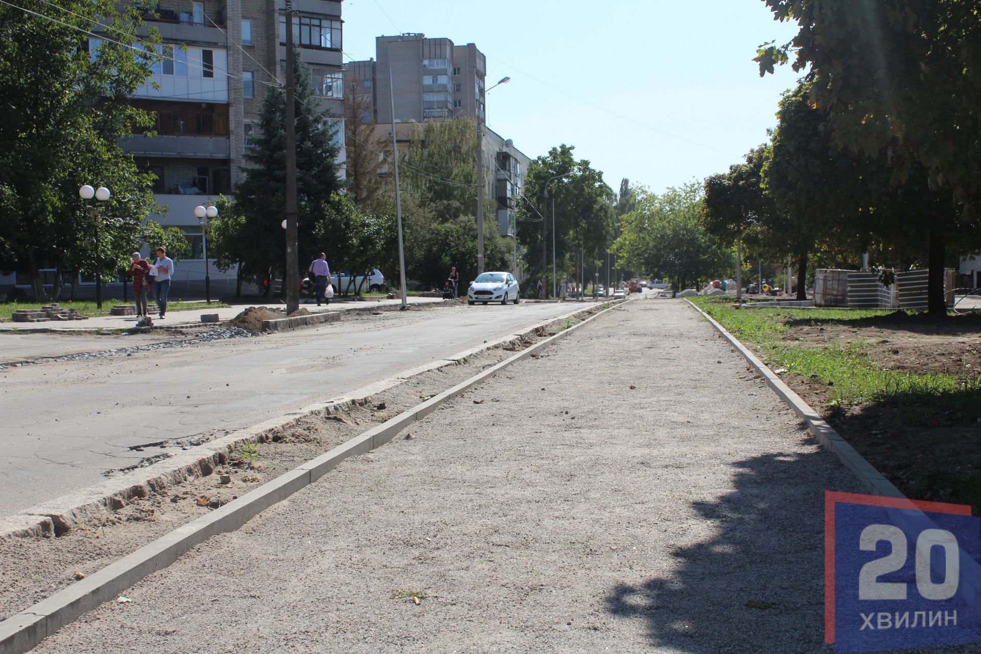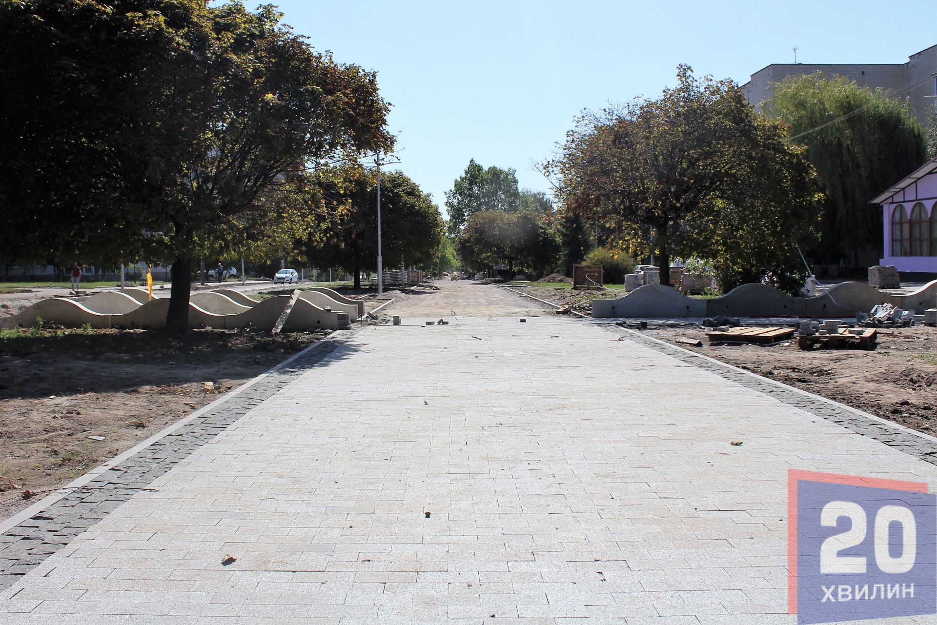 На середині цієї місцини, будівельники вкладають нову плитку на тротуарах алеї. Пішохідні доріжки будуть такими ж, як і на перших двох чергах проспекту. У деяких місцях зроблені майданчики під лавки та стоять ліхтарі з USB-зарядками.