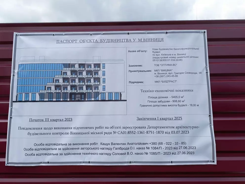 Земельна ділянка, де зведуть апарт-готель (кадастровий номер: 0510136300:01:034:0038) в комунальній власності Вінницької громади, передана в оренду товариству «Оптима-ВС». Це ж підприємство є замовником підготовчих робіт на цій ділянці.