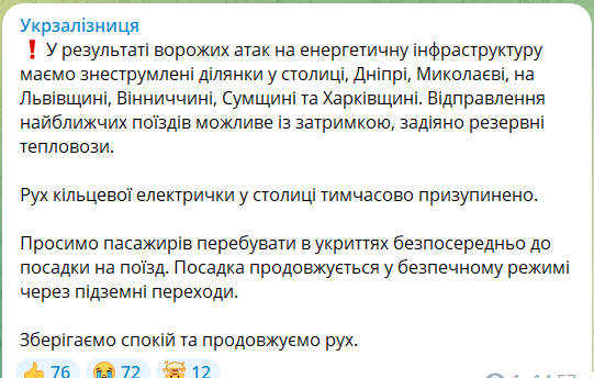 У результаті ворожих атак на енергетичну інфраструктуру маємо знеструмлені ділянки у столиці, Дніпрі, Миколаєві, на Львівщині, Вінниччині, Сумщині та Харківщині. Відправлення найближчих поїздів можливе із затримкою, задіяно резервні тепловози.