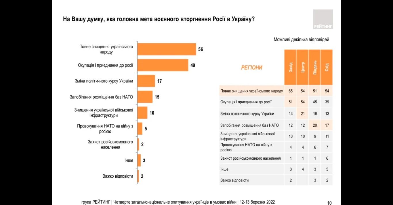 56% вважають, що головна мета вторгнення росії — це повне знищення українського народу, і ця думка домінує в усіх областях України, які поділені умовно на Захід, Схід, Південь, Центр. Ще половина опитаних вважають, що ціль нападу — окупація України та приєднання до росії.