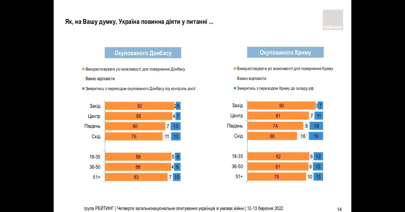 З початком повномасштабної війни, більшість українців не готові віддавати росії ані Крим (80%), ані Донбас (86%). Більшість опитаних людей вважають, що наша влада має використовувати всі важелі впливу для повернення тимчасово окупованих територій.