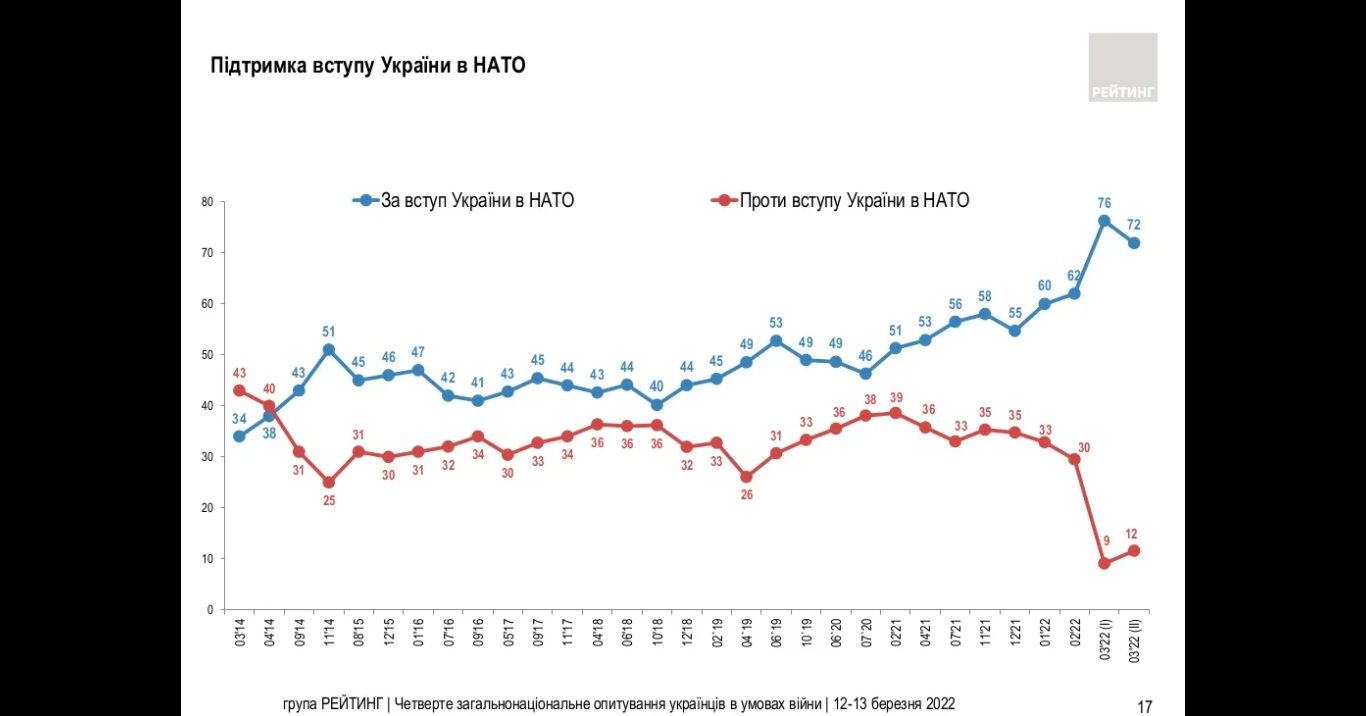 Підтримка вступу України до Північноатлантичного альянсу дещо знизилася за останні два тижні — з 76% до 72%. Основна причина, як з’ясували соціологи, відсутність рішення про закриття неба над Україною (заборонена для польотів зона, що підтримується військовою силою країн НАТО - авт.), якого вимагають майже 90% українців.