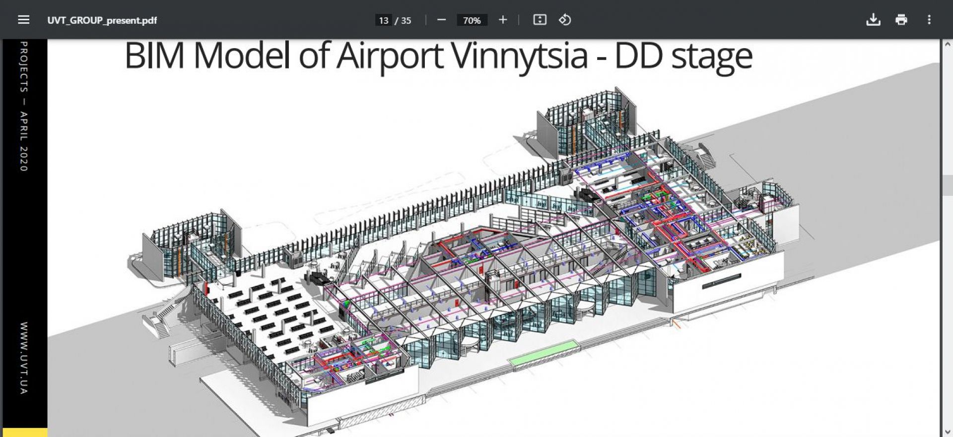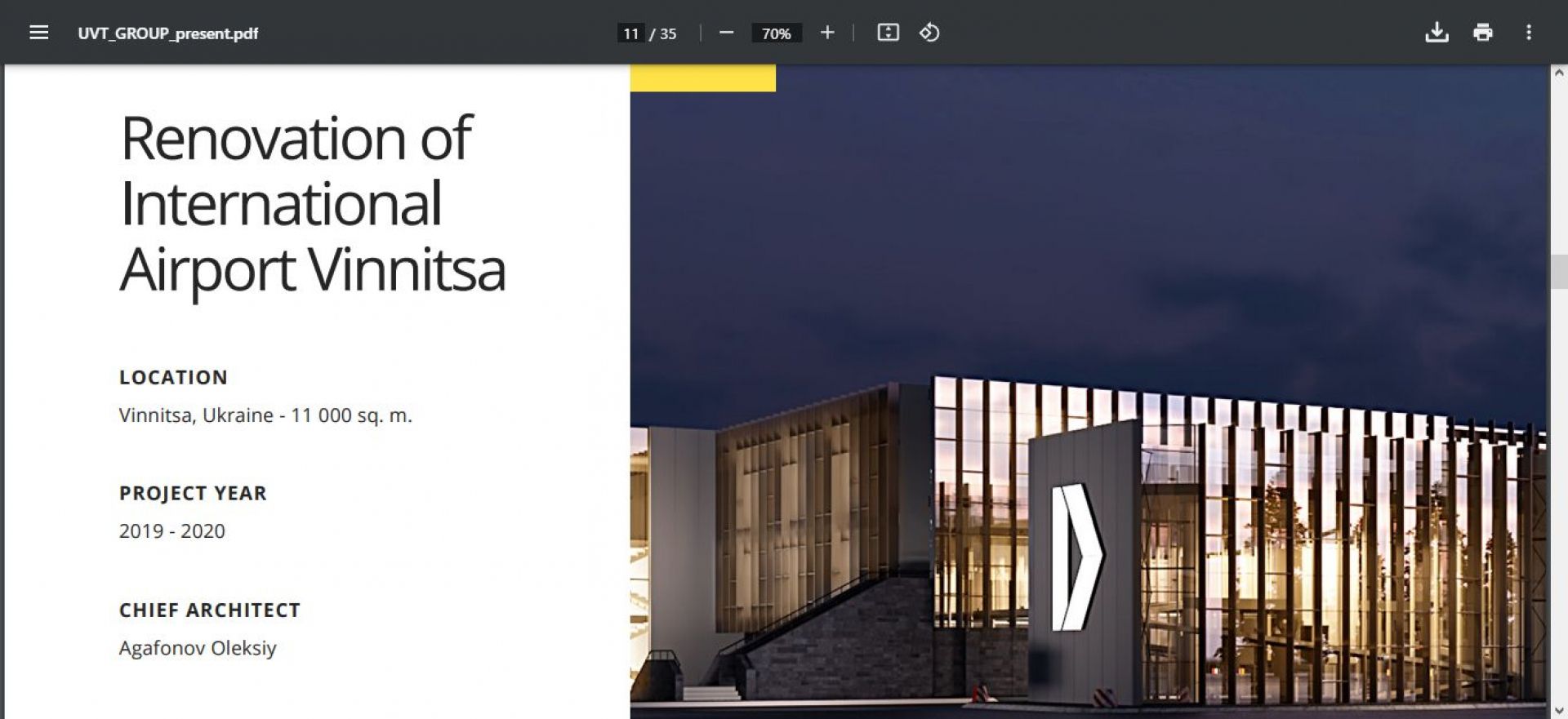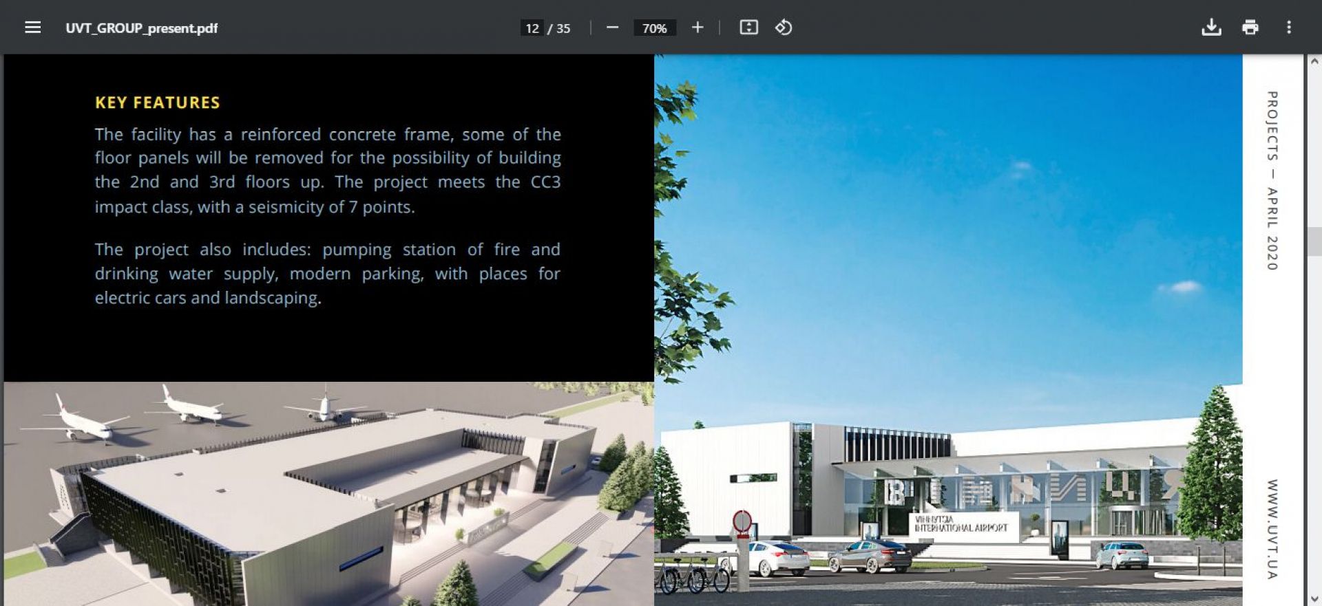 «Проект реконструкції старого терміналу в новому баченні. Пропонований розмір приміщень — 11 тисяч кв.метрів та буде складатись внутрішню та міжнародну зону авіасполучення», — йдеться на сайті розробника проекту «УВТ Груп».