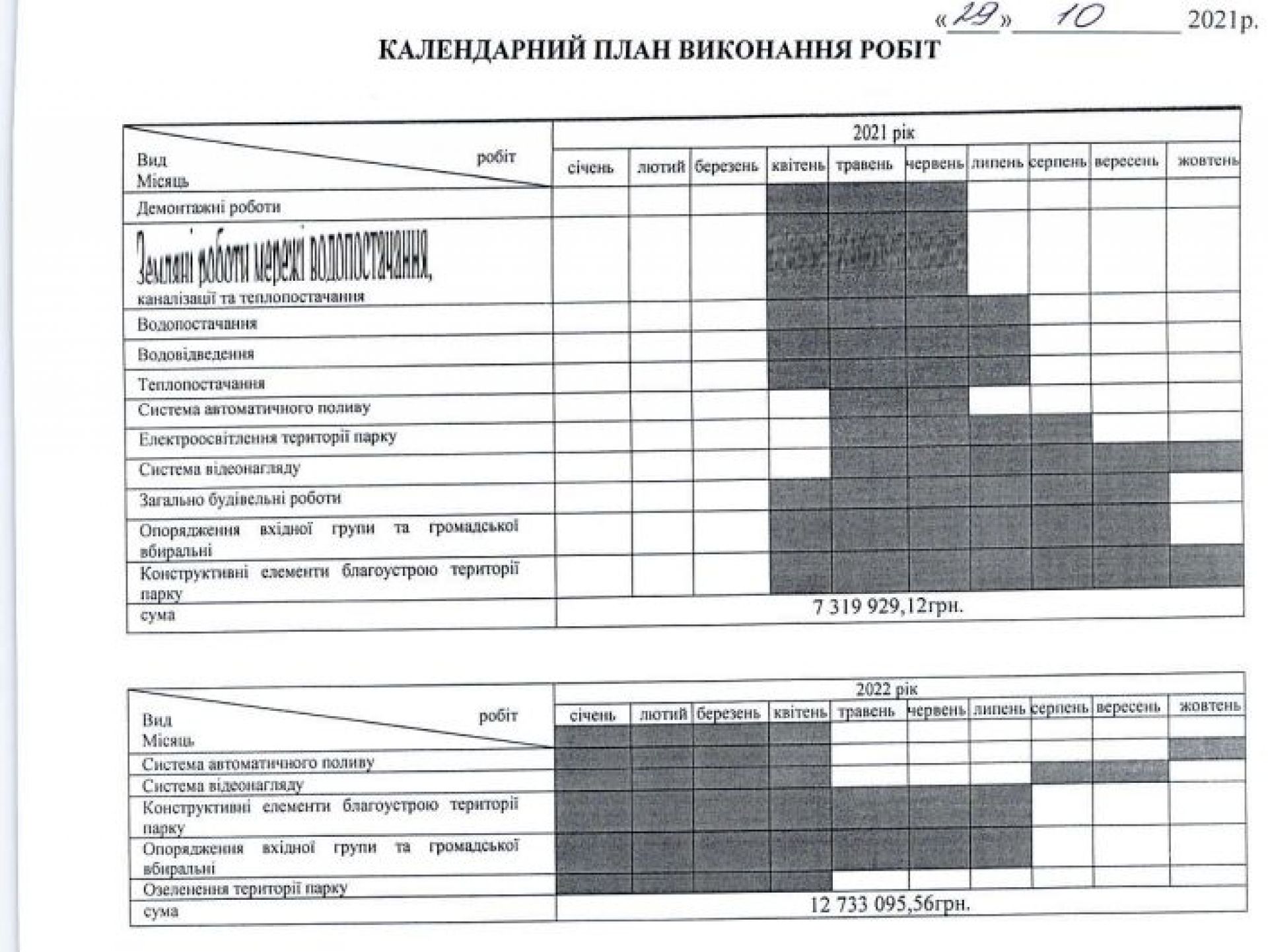 Як читаємо у змінах в тендері, роботи мали продовжити у січні 2022-го. До початку нового року в парку мали завершити вже ось що: демонтажні роботи, водопостачання, теплопостачання, систему відеонагляду, опорядження громадської вбиральні та входу тощо.