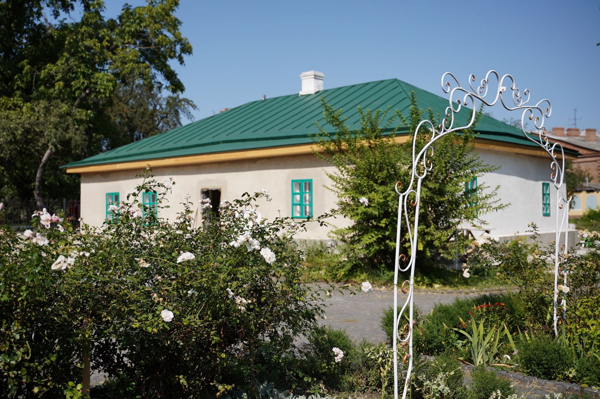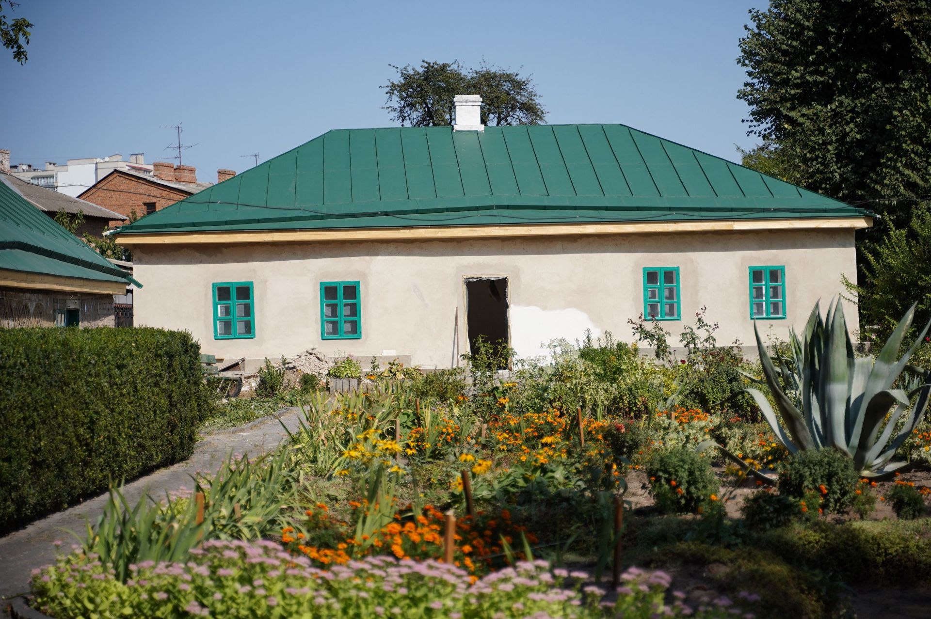 — На цей час у хаті вже зробили підсилення фундаментів та стін, виконали гідроізоляцію підлоги, поштукатурили зовнішні і внутрішні стіни. Щодо даху, то тут завершено підсилення балок перекриття, покрівля утеплена. Встановлено всі вікна. Триває виготовлення дерев’яної веранди, яку відновлюють за кресленнями. Також наразі робітники білять стіни, — каже директорка музею Лариса Кравченко. — У коморі вже завершено перекриття даху, замінено дерев’яні фронтони, очищено стіни від старої штукатурки. У сторожці підсилили балки даху. Тривають підготовчі роботи до штукатурення стін.