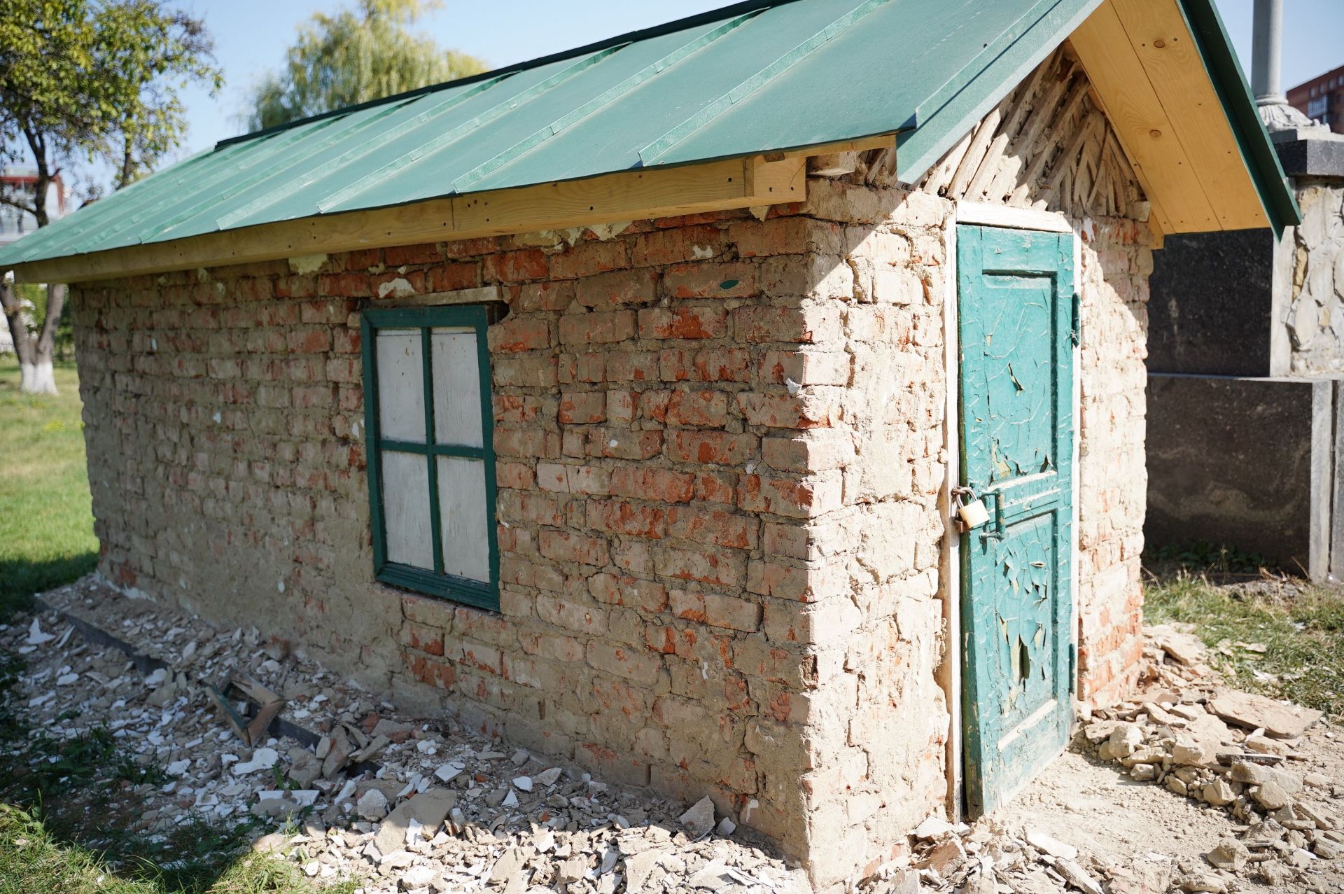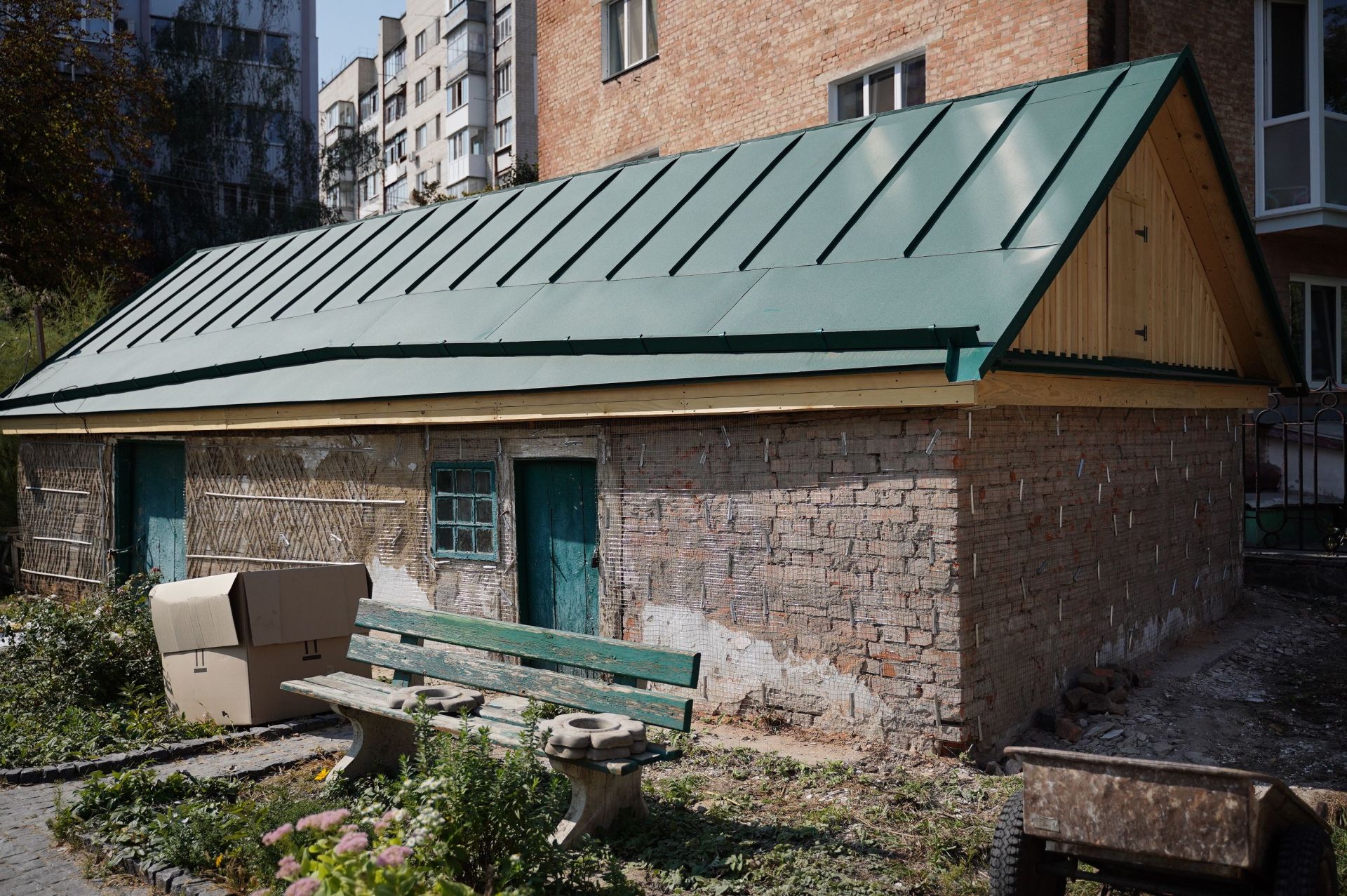 У хаті уже перекрили та утеплили дах, замінили вікна, триває побілка стін. Також перекрили комору, а у сторожці штукатурять стіни.