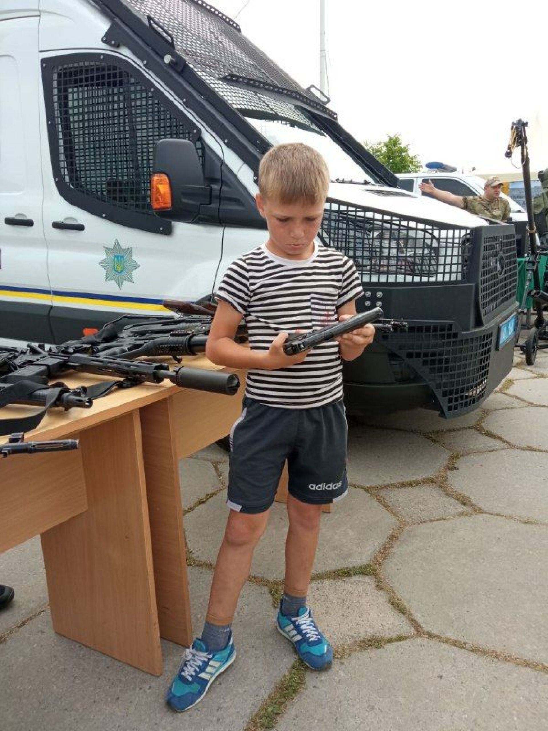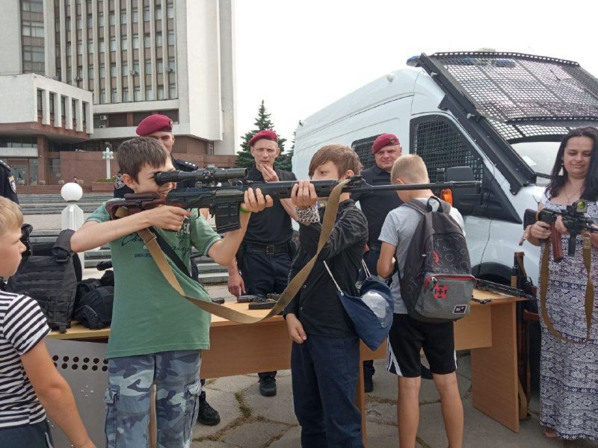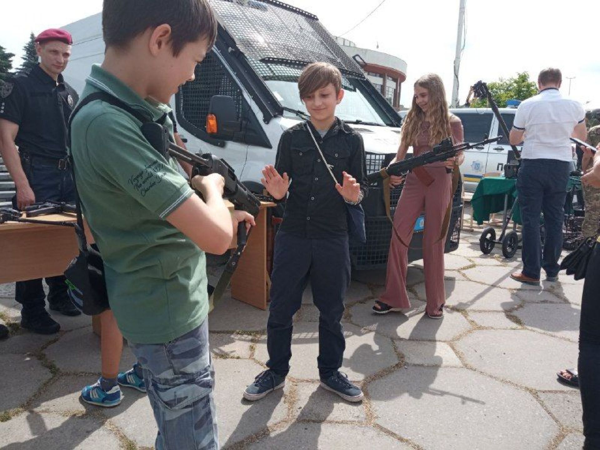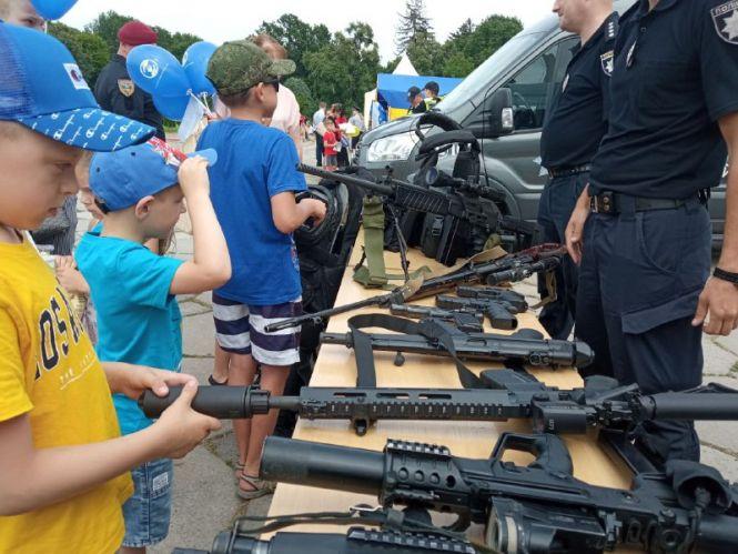 — Найчастіше діти беруть в руки гвинтівку UAR-15, її, до речі, виготовляють у нас в Україні, — говорить заступник командира роти поліції особливого призначення Михайло Стачук. — Сьогодні ми представляємо зброю та спеціальні засоби, які знаходяться у нас на озброєнні. Це і зброя радянського виробництва, наприклад, автомати й кулемет Калашникова, і сучасні зразки. Серед них є пістолет-кулемет Форт-224, який призначений для штурму.