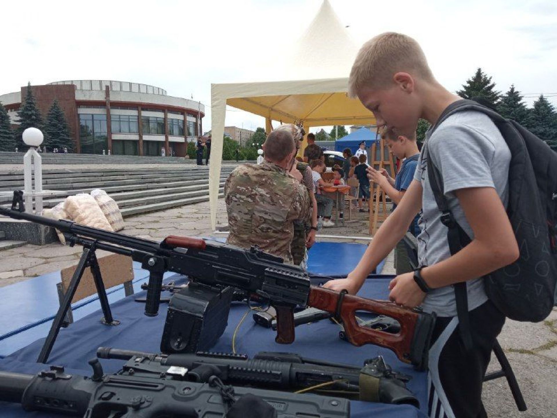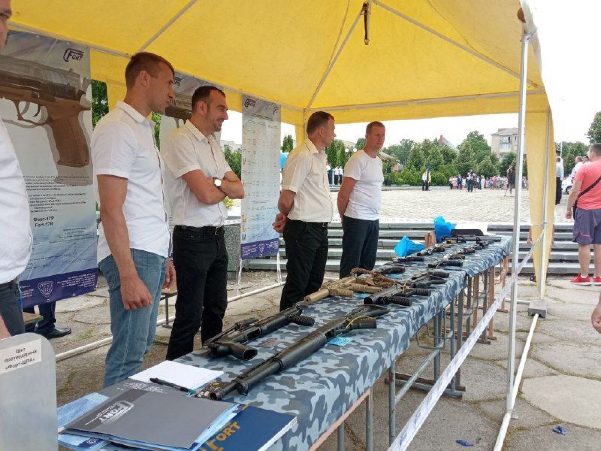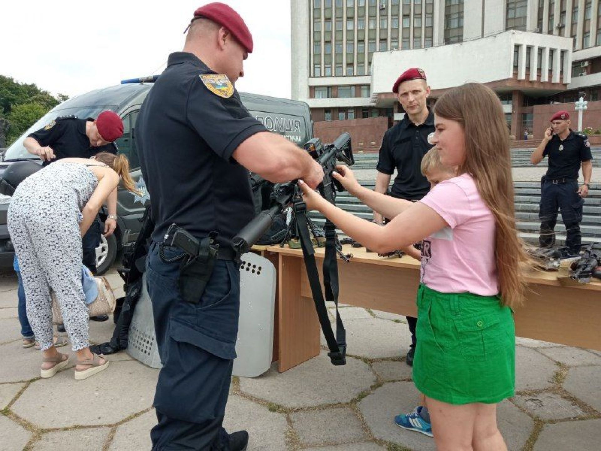 — Найчастіше діти беруть в руки гвинтівку UAR-15, її, до речі, виготовляють у нас в Україні, — говорить заступник командира роти поліції особливого призначення Михайло Стачук. — Сьогодні ми представляємо зброю та спеціальні засоби, які знаходяться у нас на озброєнні. Це і зброя радянського виробництва, наприклад, автомати й кулемет Калашникова, і сучасні зразки. Серед них є пістолет-кулемет Форт-224, який призначений для штурму.