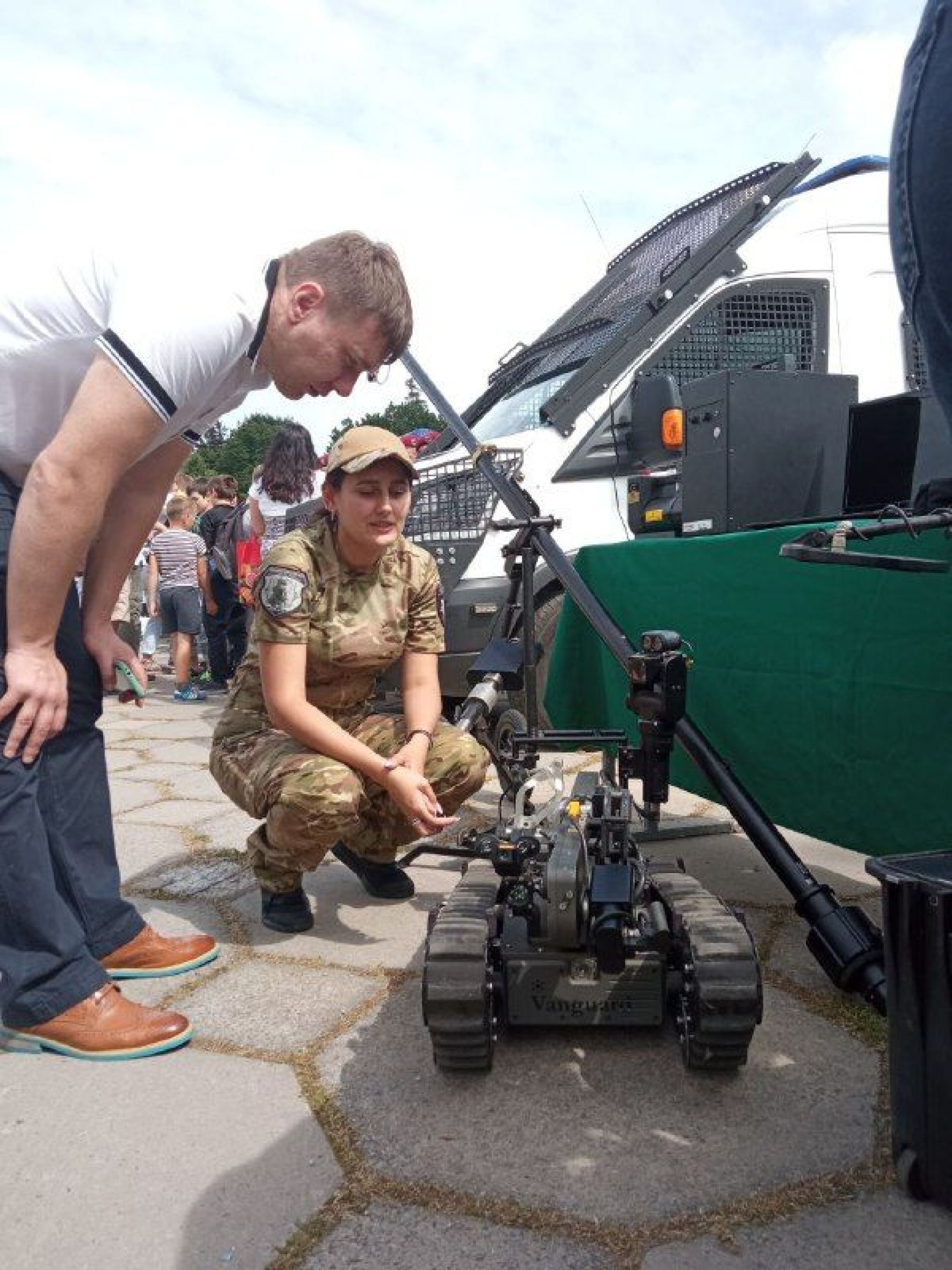 — Наша функція полягає у пошуку та знешкодженні небезпечних речовин і небезпечних предметів. Коли телефонують, що щось заміновано, тоді приїжджаємо ми, — розповідає інспекторка ВВТС Карина Ковальчук. — У нас на озброєнні з техніки є робокомплекс. Саме він під’їжджає до небезпечного предмета, бере його і відвозить до безпечного місця.