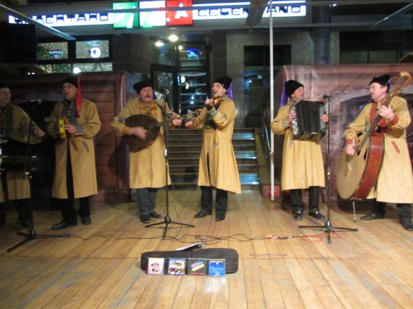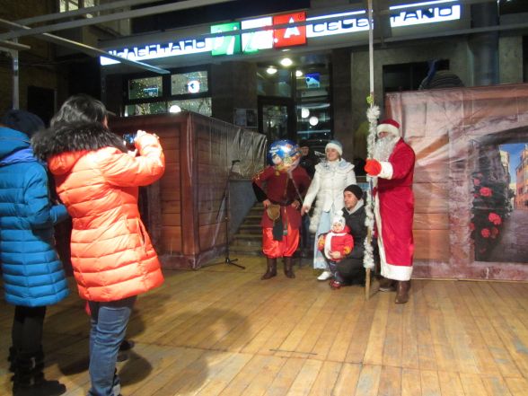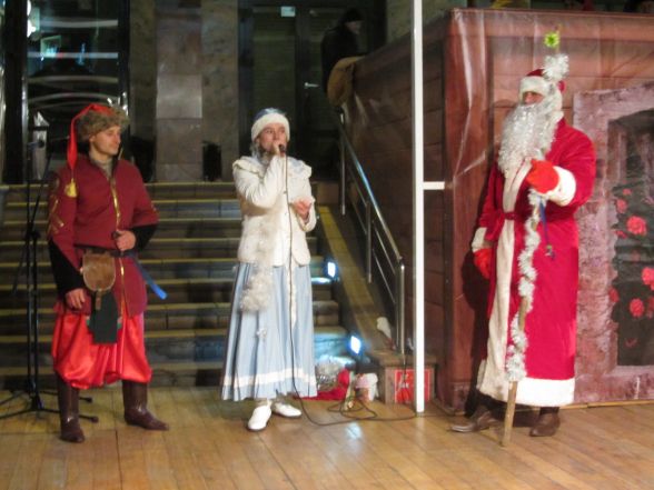 Дід Мороз зі Снігуркою щойно завершили розважати маленьких вінничан та охоче фотографуються. Тим часом на сцену поспішають музиканти та затягують пісню «Била мене мати…». Вінничани включаються в розвагу й помалу починають підспівувати.
