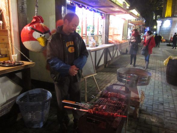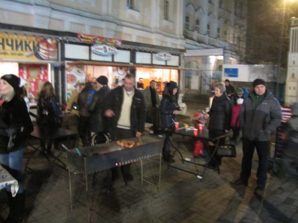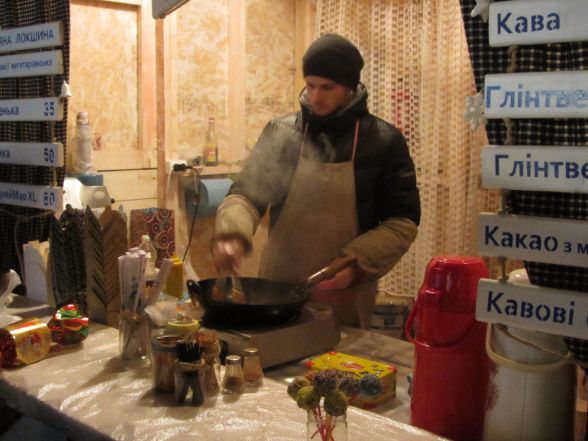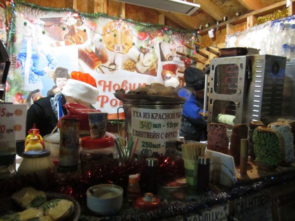 В новорічних кіосках вінничанам пропонують поласувати стравами на будь-який смак: від шашлику та вареників до східних солодощів та страв тайської кухні. 100 грамів шашлику коштує 27 гривень. Його аромат відчутно аж на вулицю Соборну. Порція глінтвейну продається від 15 до 20 гривень.