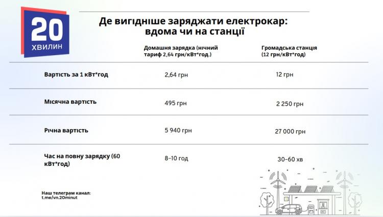 Дані взяті за тарифами літа 2025 року, при зарядці з 0 до 100% батареї. Варто враховувати, що при домашній зарядці завжди є невеликі втрати енергії — приблизно 5–15%, тому фактично споживання трохи вище номінального.