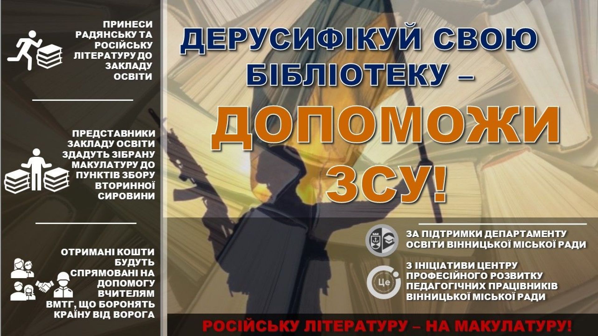- У Вінниці стартувала акція «Російську літературу — на макулатуру». Долучитися до неї можуть усі бажаючі. Для цього достатньо принести російськомовну чи радянську літературу до шкіл міста.
