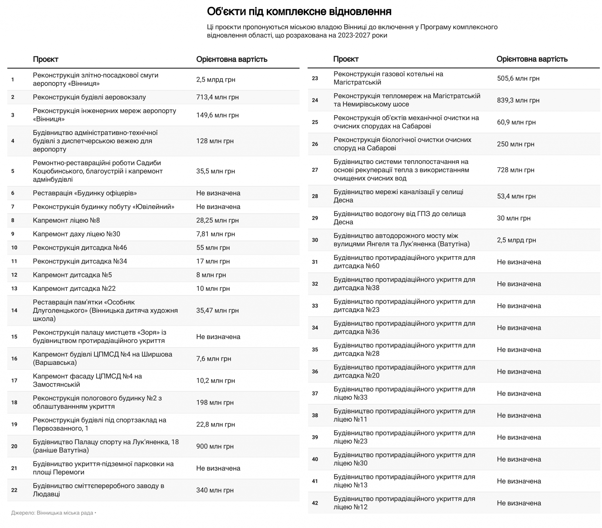 Ми переглянули цей документ. У ньому 42 об’єкти. Серед них є відновлення будівель, що були зруйновані росіянами: ремонт Будинку офіцерів та «Ювілейного», ліцею №8, реконструкція аеропорту «Вінниця».