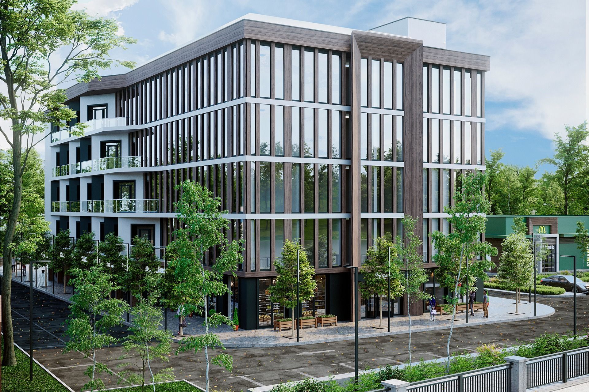 З інфраструктури тут планується кафе, коворкінг, фітнес зал, лобі, комерційні площі на першому поверсі, конференц-зал. Крім того буде аптека, салон краси, мінімаркет, зарядні станції для авто, поштомат, пункт прокату велосипедів, парковка. Девелопером цього об’єкта є київська компанія «Arha Group».