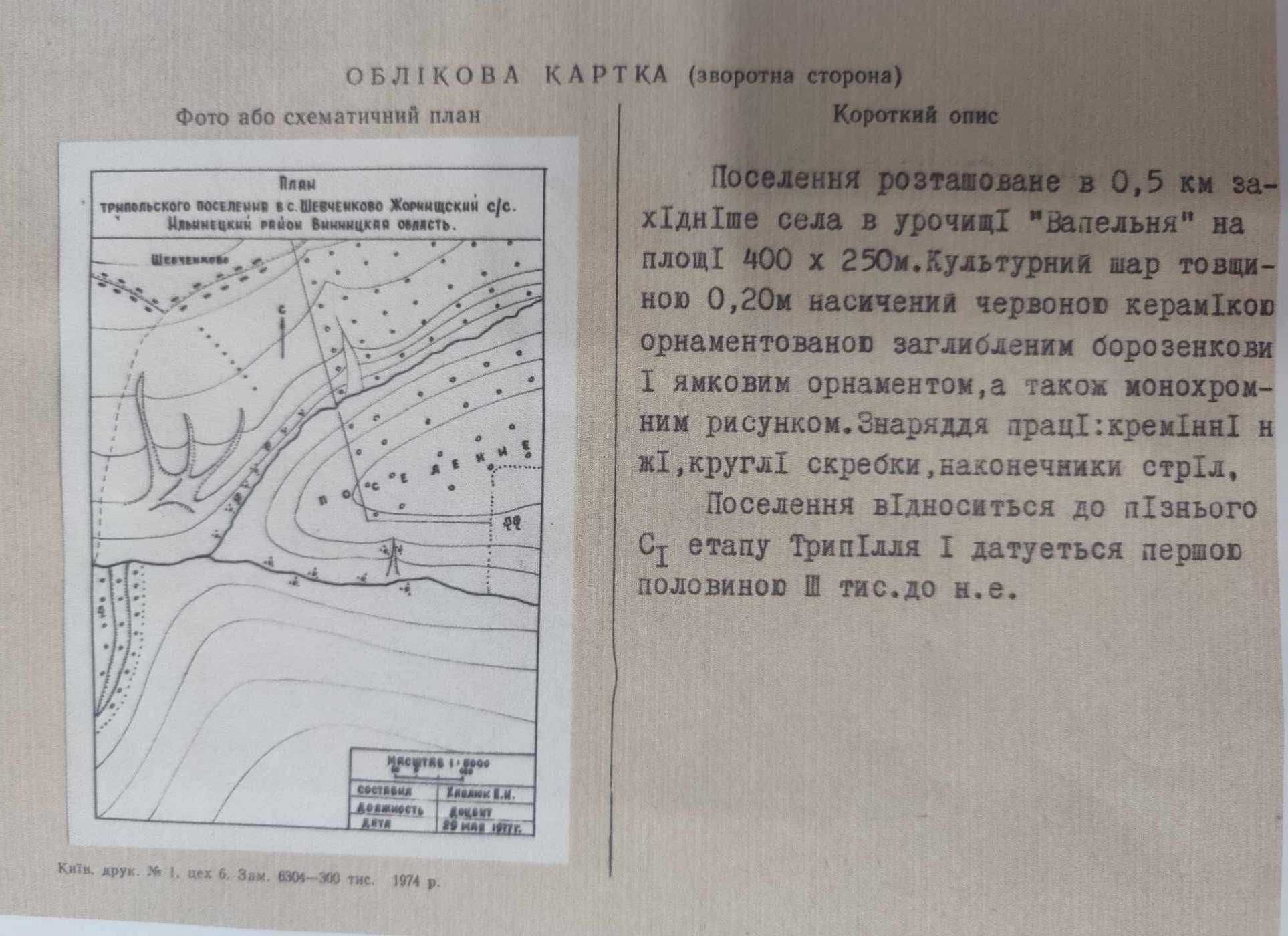 Пані Людмила ще з дитинства знає, що схил в урочищі «Вапельня» є унікальним місцем. Археологи виявили тут Трипільське поселення. Чула про це від старих людей, розповідали батьки. Вони були очевидцями роботи археологів. Тепер Людмила Вапельник має офіційне підтвердження їхніх слів. Жінка показує довідку управління містобудування і архітектури обласної адміністрації. У ній сказано, що урочище «Вапельня» є пам’яткою археології, історії та культури.