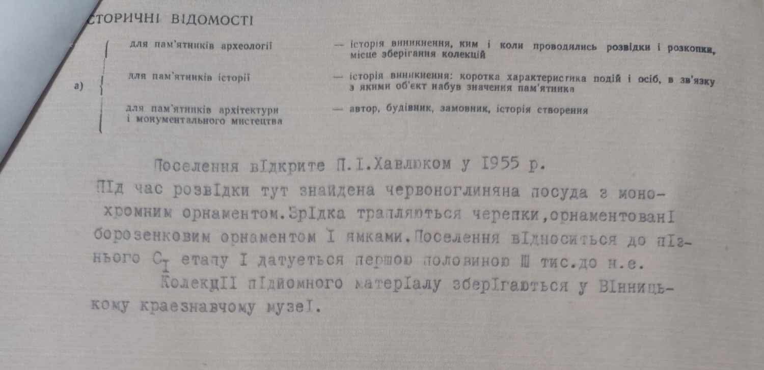 «Поселення розташоване на пологому мисі, утвореному двома струмками, —записав у своєму звіті науковець Хавлюк. — На зораній поверхні мису простежуються залишки жител у вигляді глиняної обмазки. На місці жител знаходиться червона кераміка з борозенковим і ямковим орнаментом, а також сіра з монохромним розписом.