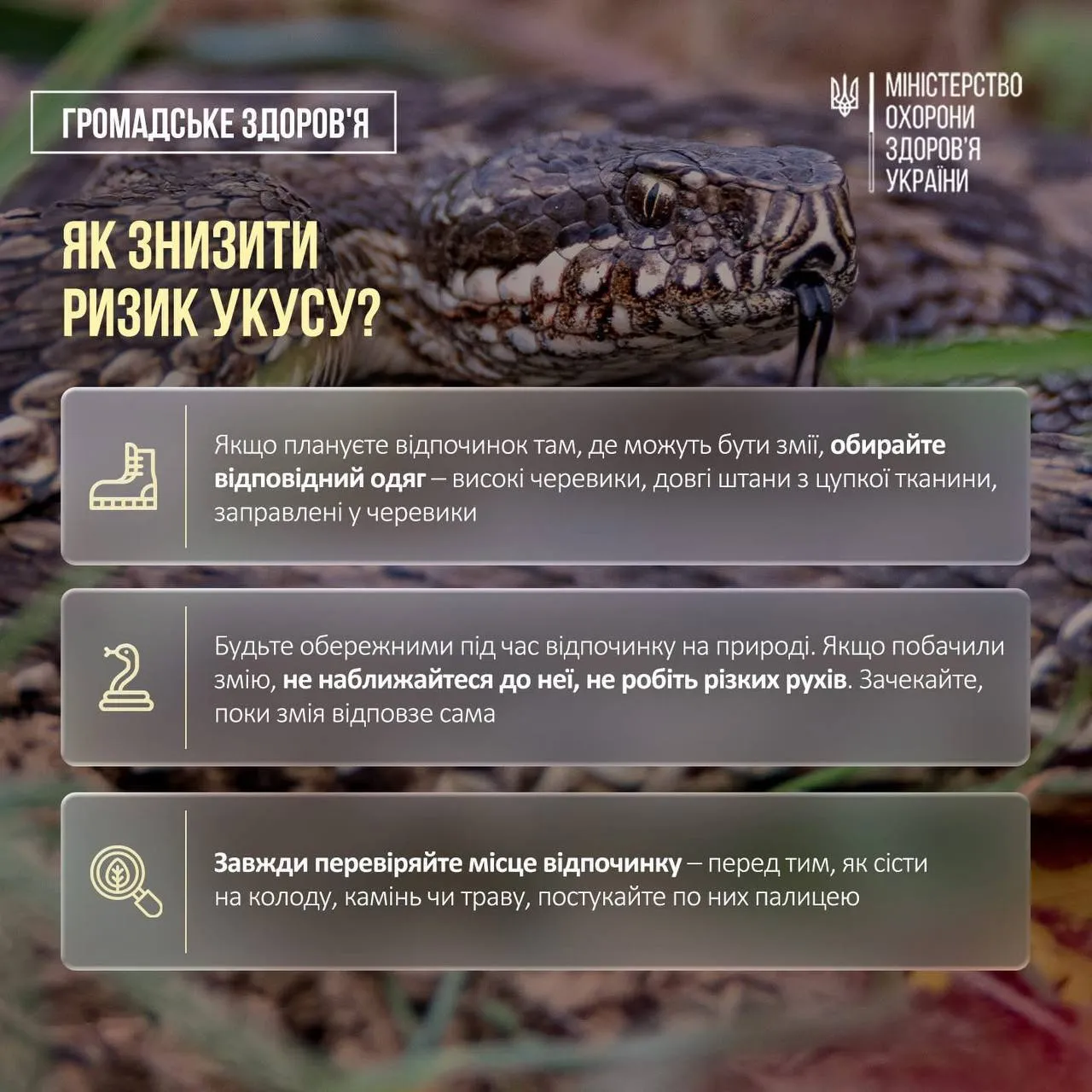В Україні стартував весняний сезон активності плазунів, зокрема й отруйних змій. У Міністерстві охорони здоров’я наголошують: хоча більшість змій не становлять загрози для людини, є й ті, яких слід остерігатися.