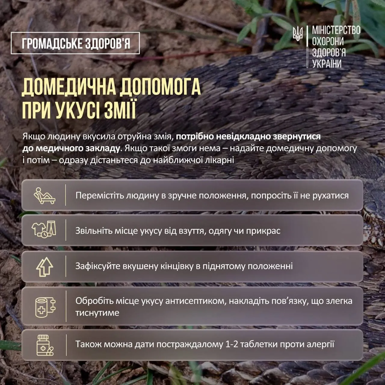 Часто першу допомогу при укусах змії надають неправильно. Категорично забороняється, наприклад, накладати джгут на кінцівку.