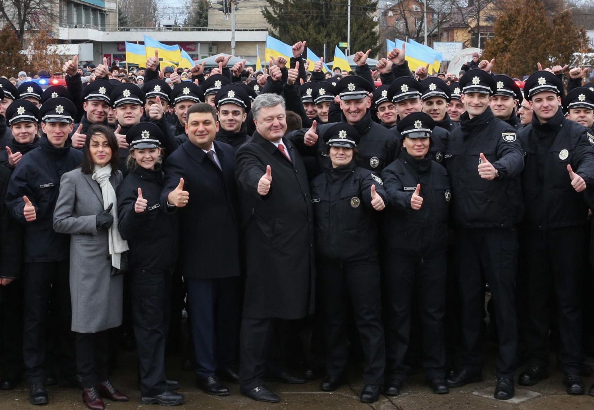 Вітає поліцейських спершу Петро Порошенко. Потім Володимир Гройсман. Врешті виступає вже на публіку Хатія Деконаїдзе і плутає другу річницю Майдану з першою, але потім виправляється.
