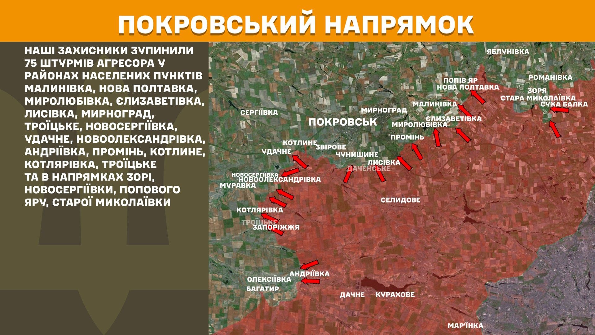 Найгарячішою точкою залишається Покровський напрямок, де українські захисники зупинили 75 штурмів агресора. На Новопавлівському напрямку відбито 23 спроби ворога прорвати оборону. На Оріхівському напрямку три наступальні дії противника успіху не мали. На Придніпровському напрямку зупинено одну спробу ворожого просування. На Курському напрямку українські війська відбили 14 атак російських загарбників, які також завдали 12 авіаційних ударів та здійснили 236 артилерійських обстрілів.