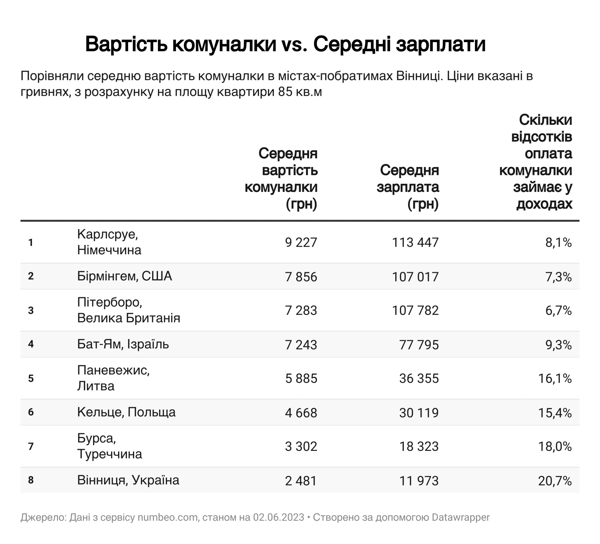 У підсумку ми порівняли міста за вартістю комуналки між собою. А також, спираючись на дані сервісу numbeo.com, вирахували скільки відсотків оплата комуналки займає у середніх зарплатах мешканців цих міст.