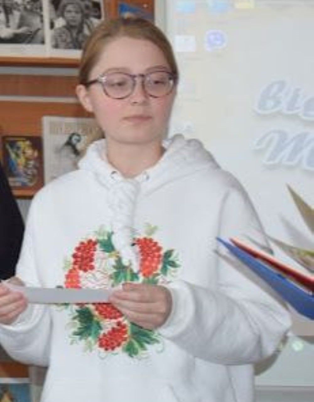 — Коли бачиш, як по обличчю людини стікають краплини крові, мимоволі уявляєш наших воїнів на фронті, — продовжує викладачка пані Матієнко. — Повірте щиро, відчула мороз по спині. А ще додали емоційного сприйняття рядки внизу малюнка: «Поховайте, та вставайте!..