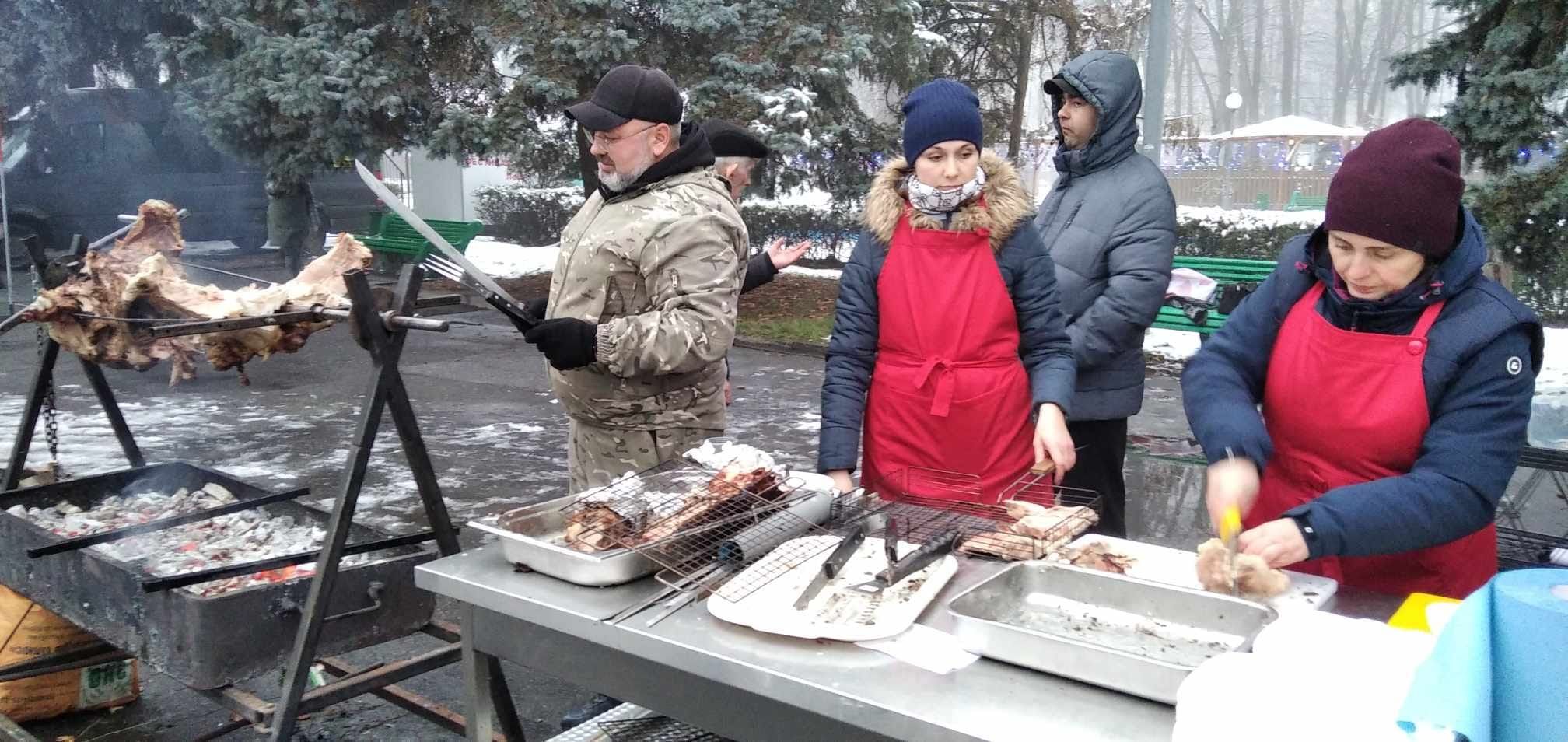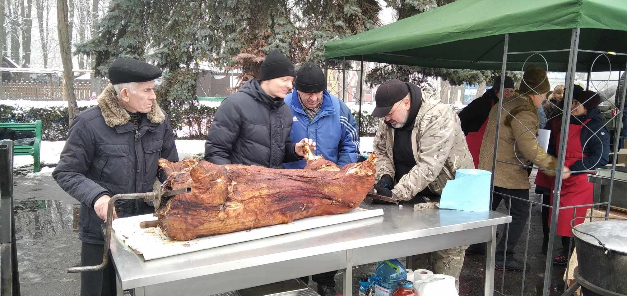 Мабуть, локація Центру на заході була найвидовищнішою. Майстерні кухарі на чолі з директором Валерієм Дяківим смажили кабанчика на вертелі, котрого любʼязно надали давні друзі закладу.