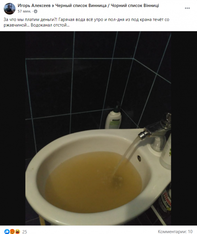 Також питання неякісної води підняв цього дня у групі «Чорний список Вінниці» Ігор Алексеєв. Чоловік опублікував фото, де видно іржаву воду.