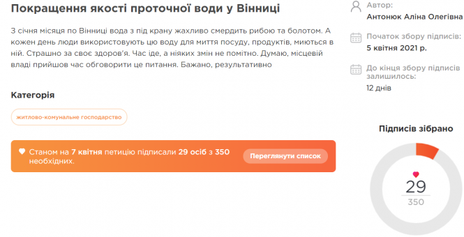 Вінничанка Аліна Антонюк подала петицію під назвою «Покращення якості проточної води у Вінниці». Звернення опублікували 5 квітня.