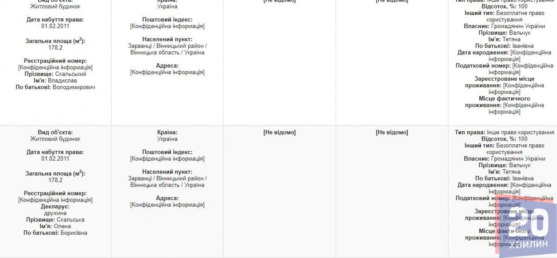 Скальський з дружиною і дочкою проживають в будинку в Зарванцях, власником якого є дружина. Чиновник має земельну ділянку в цьому ж селі і вже більше трьох років будує будинок. З нерухомого майна у чиновника також є дві квартири у Вінниці: площею 34 кв.м і 64,2 кв.м - право користування останньою він придбав в 2018 році. А також гараж на 20 кв.м.