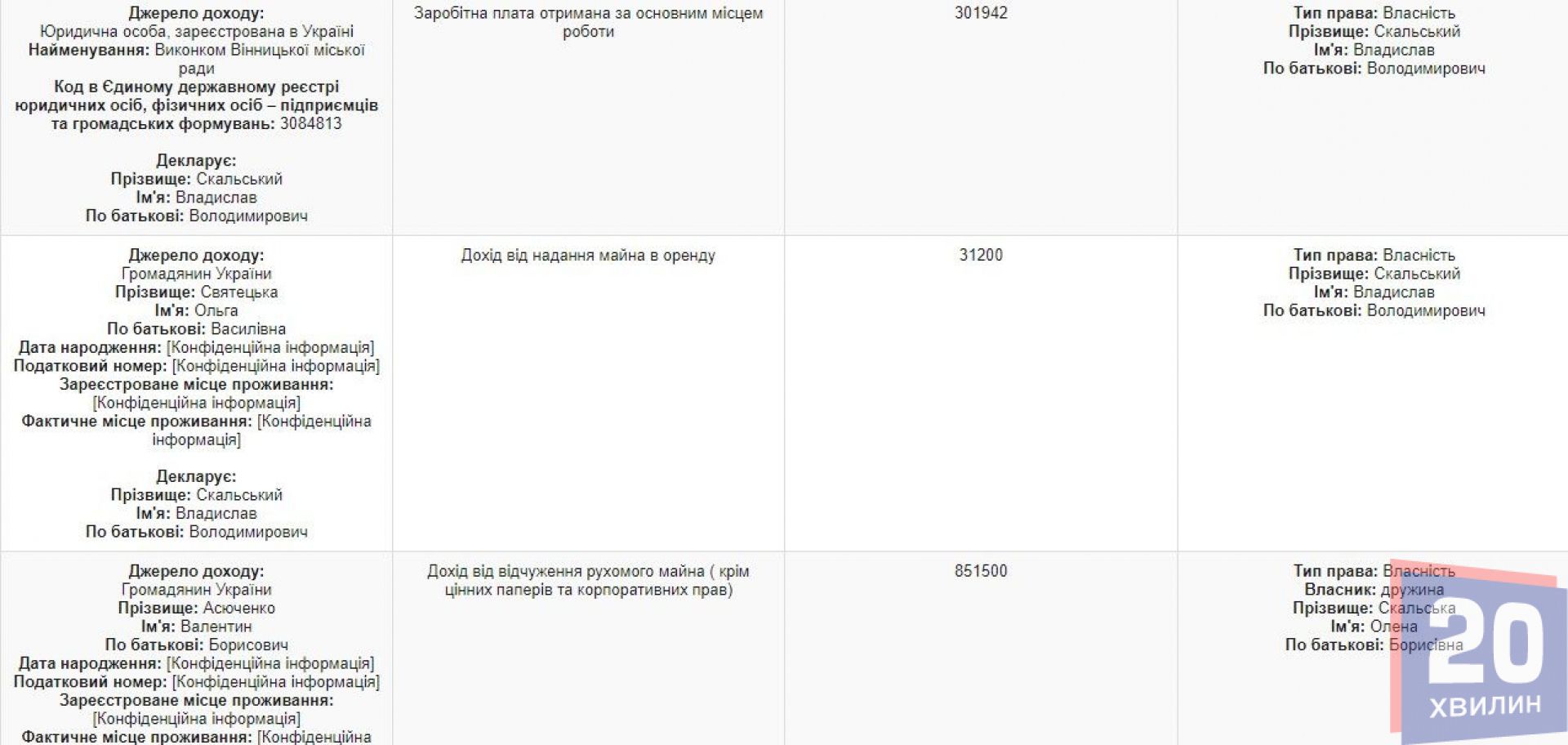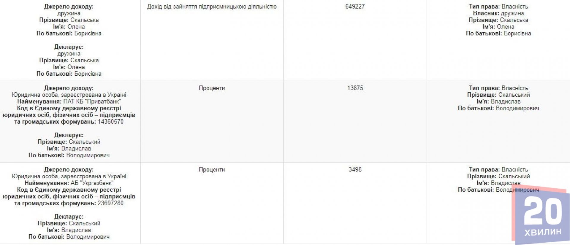Дружина Владислава Скальського - успішна бізнесвумен. У минулому році її дохід від підприємницької діяльності склав 649 227 грн. Також бюджет Скальського поповнився за рахунок банківських відсотків - 13 875 грн і 3 498 гривень.