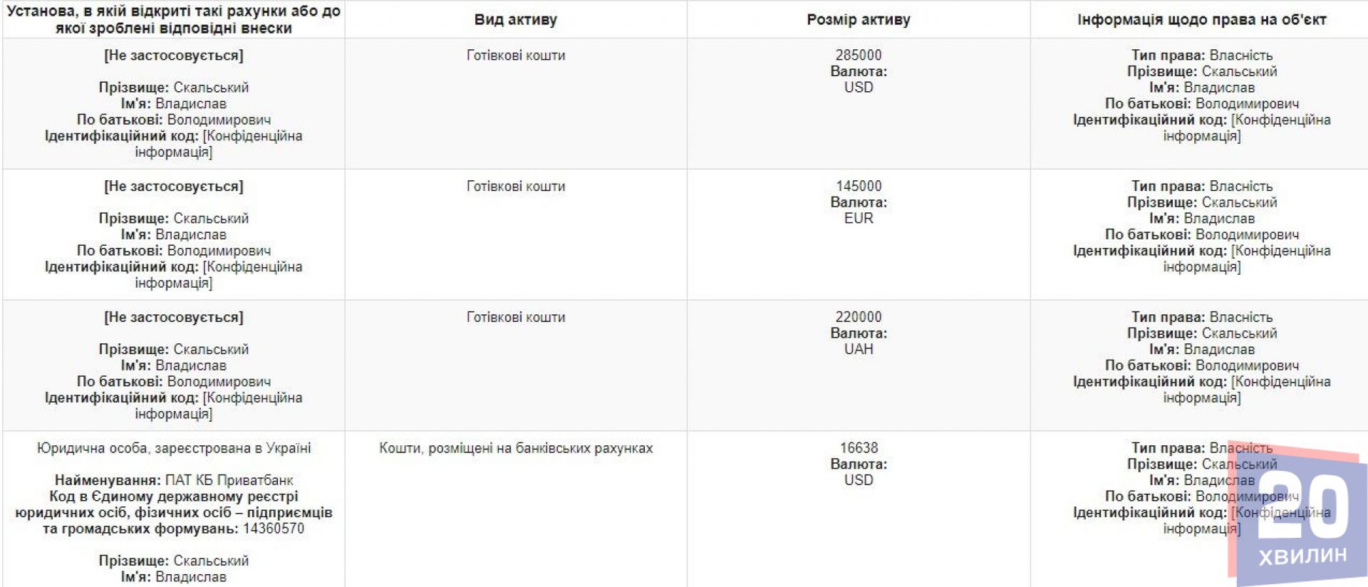 Колишній заступник мера Вінниці задекларував $ 285 тис., € 145 тис., 220 тис. грн. На банківських рахунках Скальський тримає $ 16 638, 7 547 грн і 148 299.