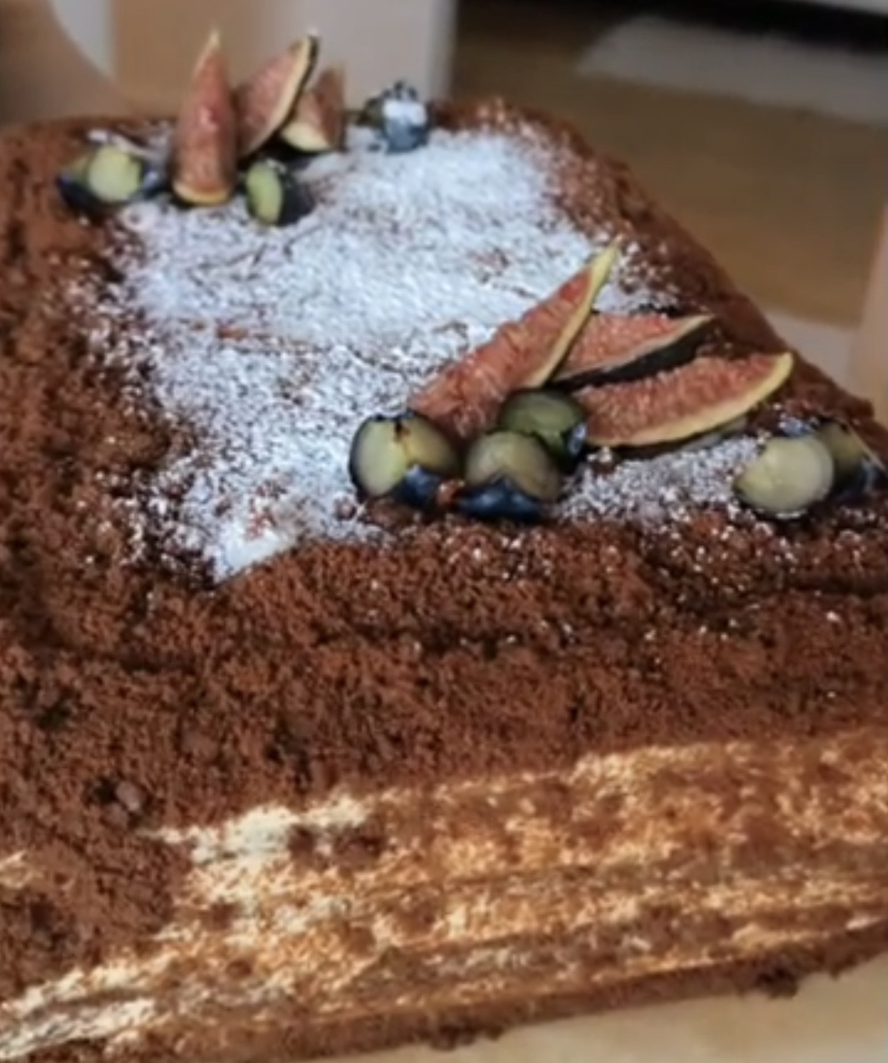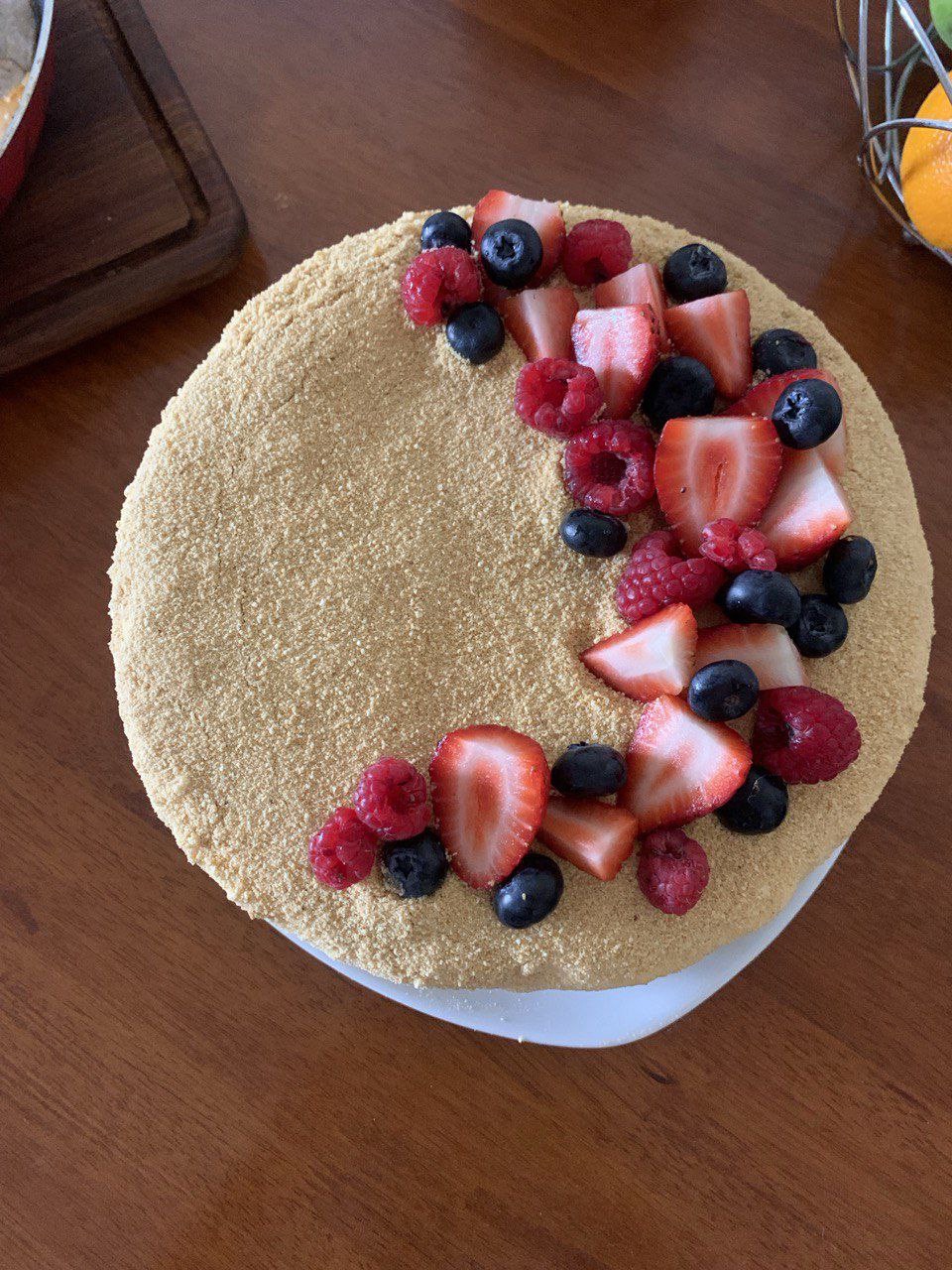 Збірка: Рясно змащуйте кожен корж кремом. Не забувайте про боки. Подрібніть залишки коржів у блендері та посипте торт з усіх боків, як на фото.