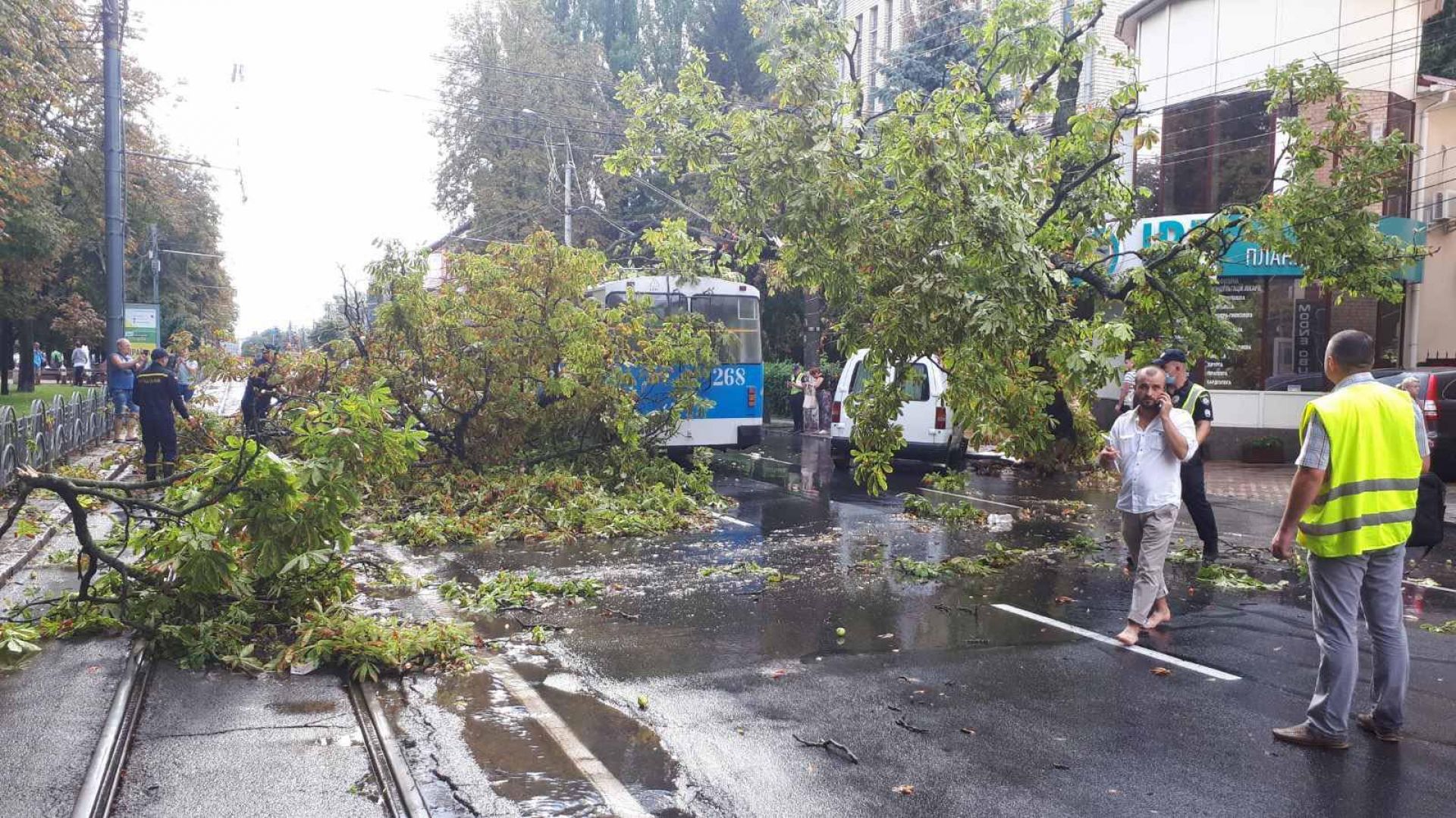 — Пориву вітру сягали 22 метри за секунду. Це штормовий вітер, і така ситуація відноситься до «жовтого» рівня небезпеки. Стихія спричинила велику кількість поривів дротів, через відсутність напруги контактної мережі по вулиці Пирогова 25 серпня стояли тролейбуси та трамваї. Також не працював транспорт і на Немирівському шосе, — зазначають на сайті міськради.