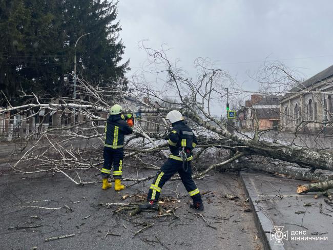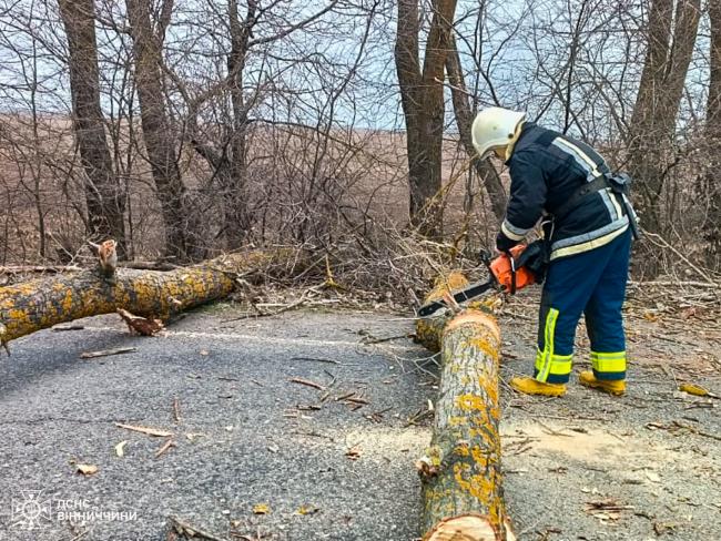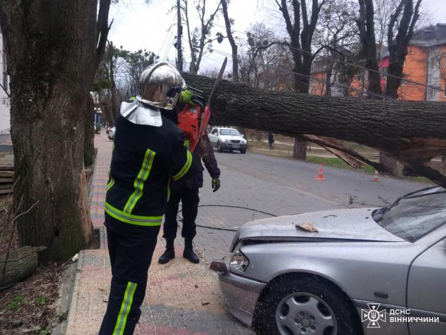 — Бійці ДСНС прибирали повалені вітром дерева з автошляхів у місті Калинівка, селищах Літин та Тростянець, а також у Тиврівській та Жмеринській громадах. У Вінниці на вулиці Князів Коріатовичів, під час пориву вітру, стовбур дерева впав на припаркований легковик. На щастя, в салоні авто нікого не було, — кажуть рятувальники.