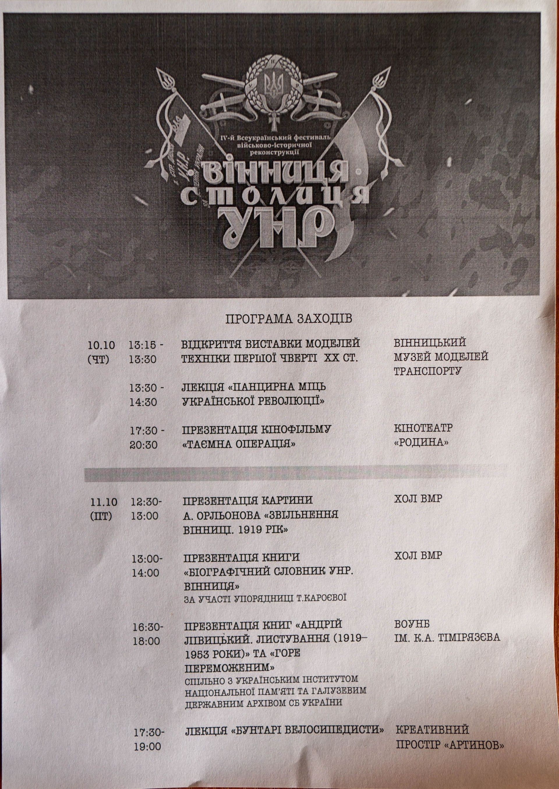 Святкування розпочнеться у четвер, 10 жовтня, з відкриття виставки моделей техніки першої чверті ХХ століття, яка проходитиме у Музеї моделей транспорту. Там же відбудеться публічна лекція про панцирну міць доби української революції. Ввечері на екранах кінотеатру «Родина» вийде анонсований ще два роки тому художній фільм режисера вінничанина Валерія Шалиги «Таємна операція». Нагадаємо, під час зйомок мав робочу назву «Замах на Петлюру» і присвячений тій добі. У рамках фестивалю відбудеться декілька безкоштовних показів фільму.