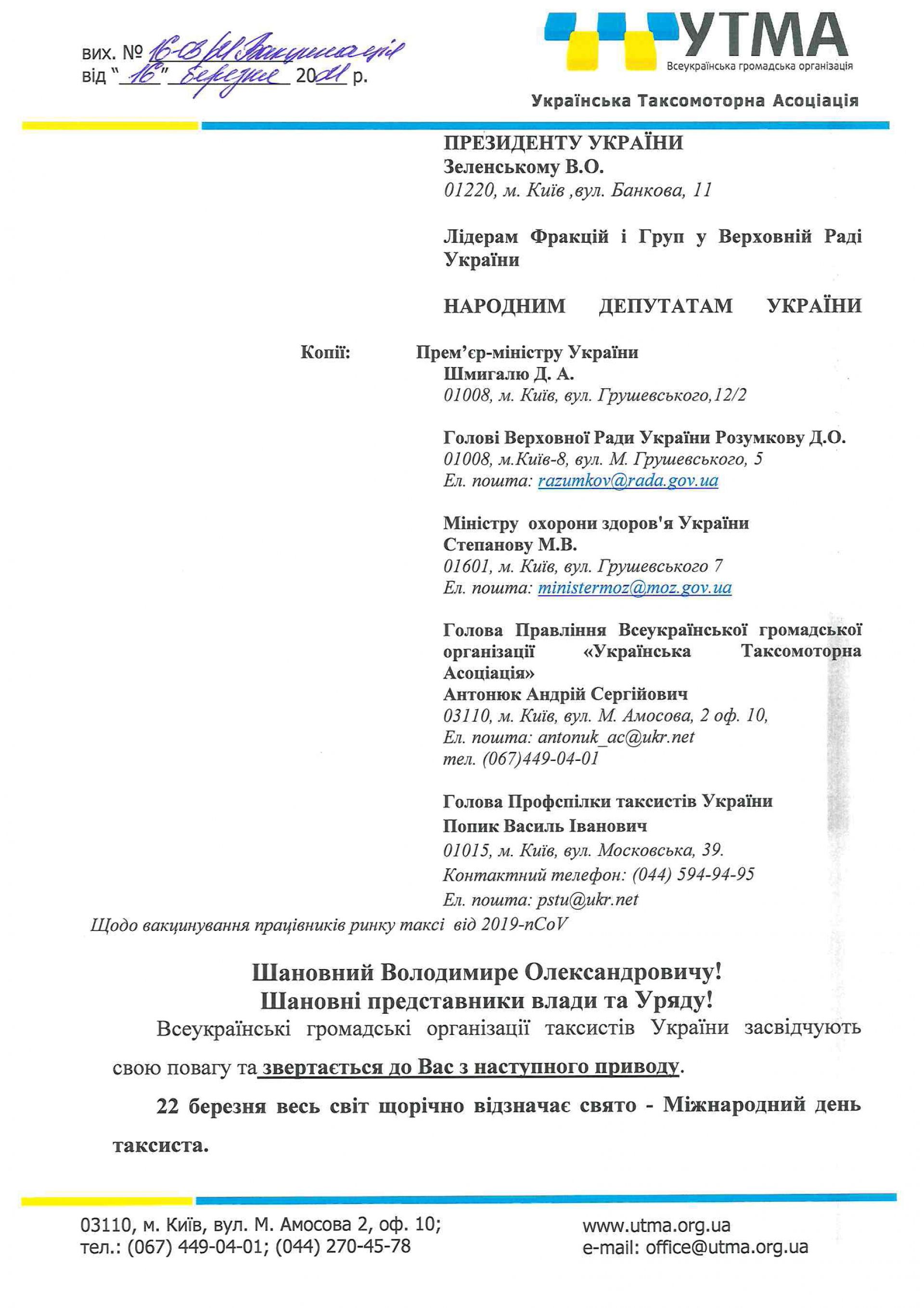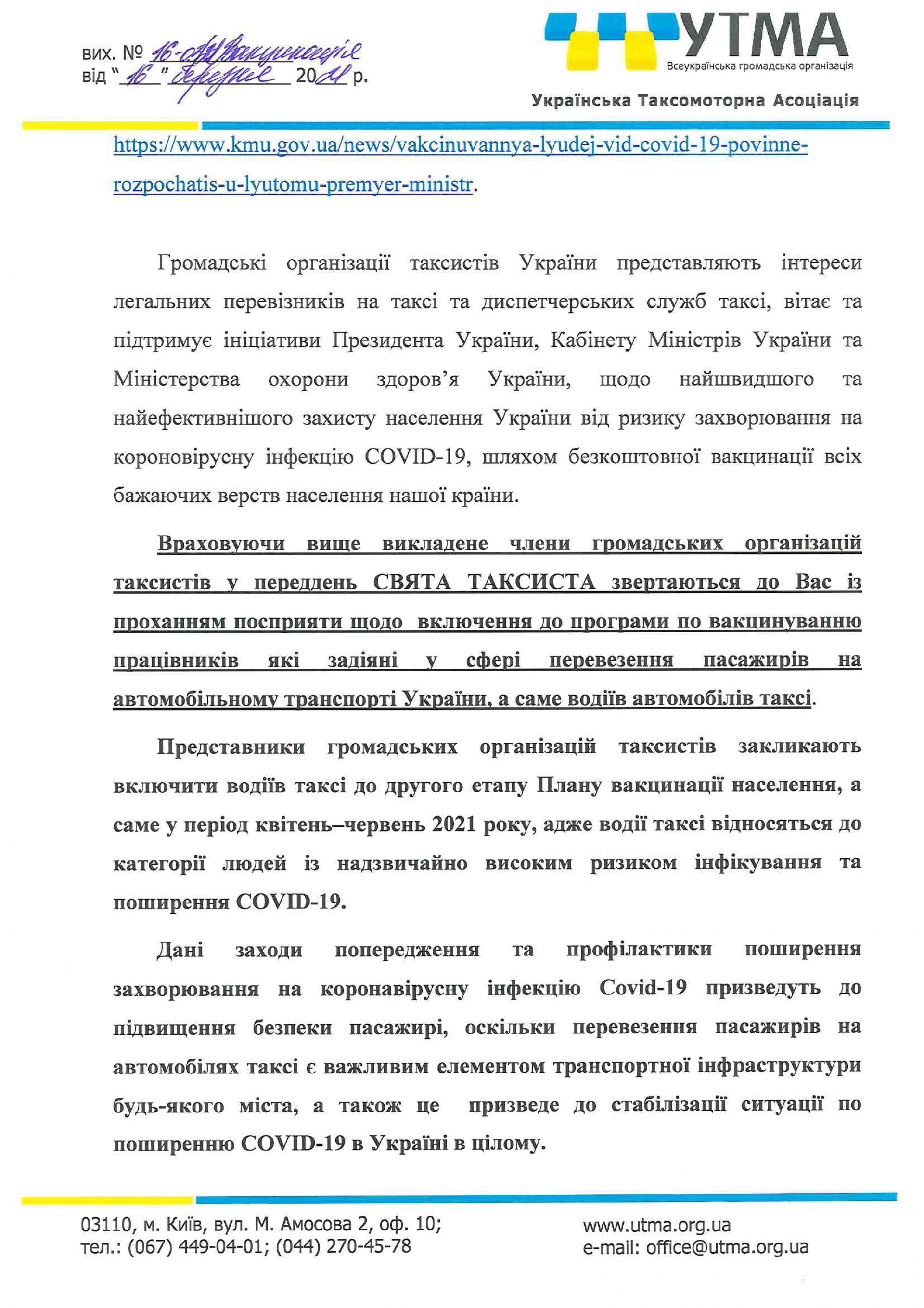 — Члени громадської організації таксистів у переддень свята таксиста звертається до вас із проханням посприяти щодо включення до програми по вакцинування працівників, які задіяні у сфері перевезення пасажирів на автомобільному транспорті України, а саме водіїв автомобілів таксі, — відзначають у документі.