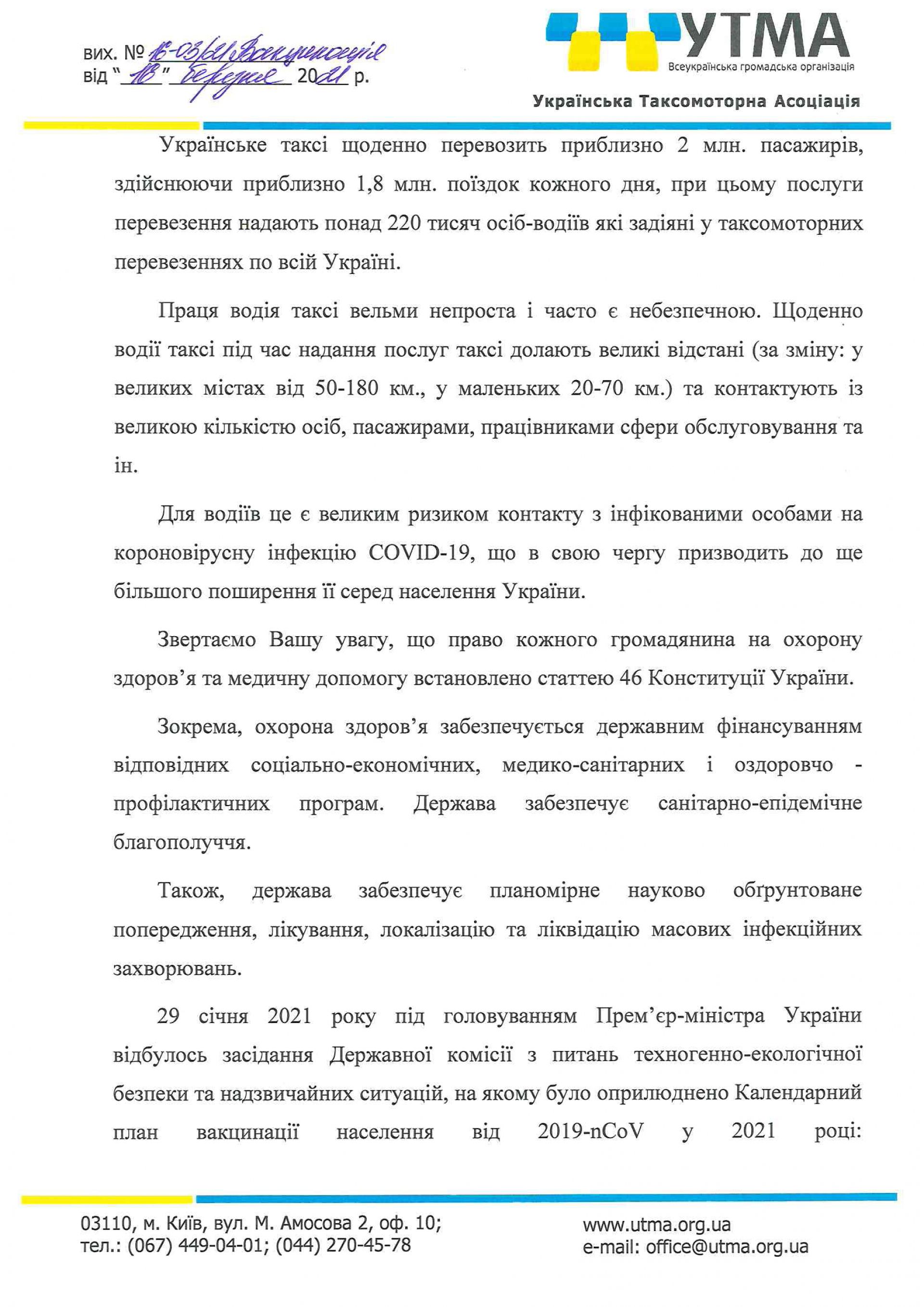 Таксисти наводять відповідні закони та умови, за якими вони також мають потрапити до перших рядів щеплених згідно з календарним планом вакцинації населення.