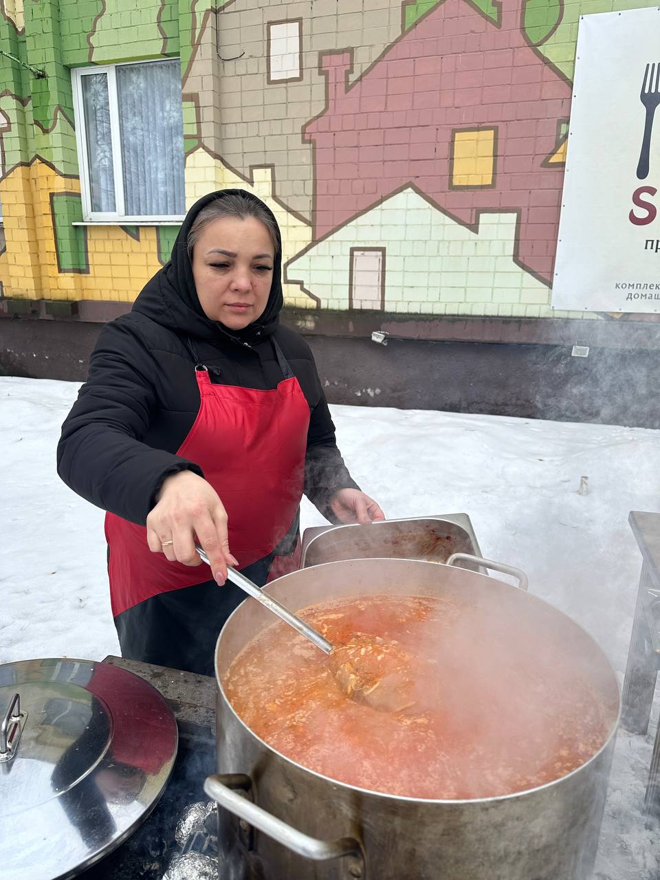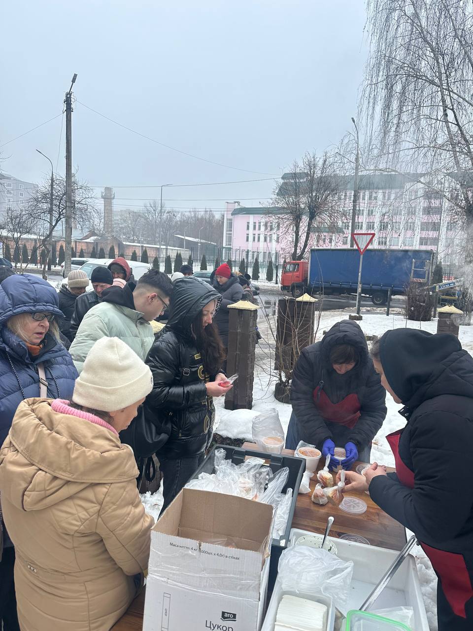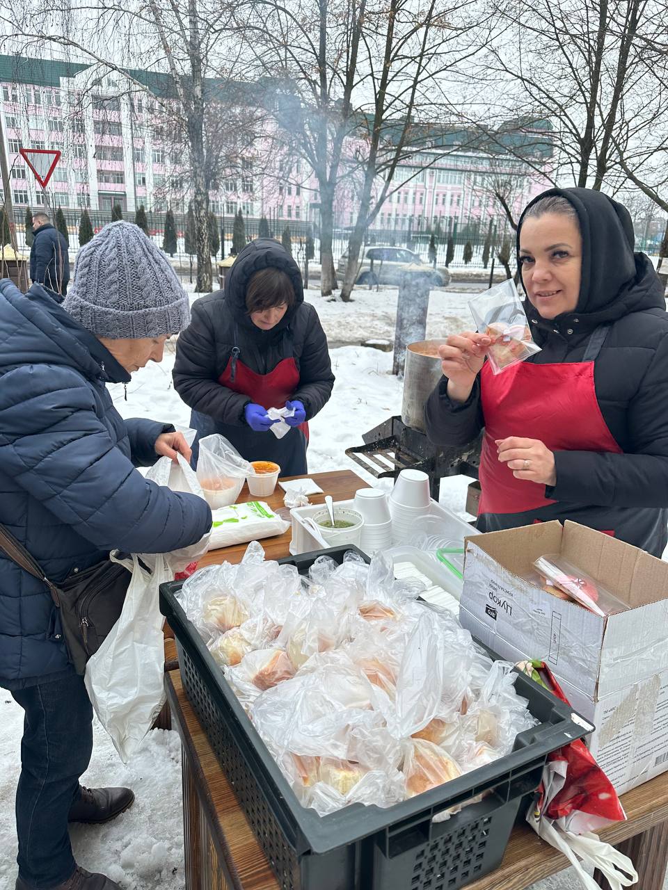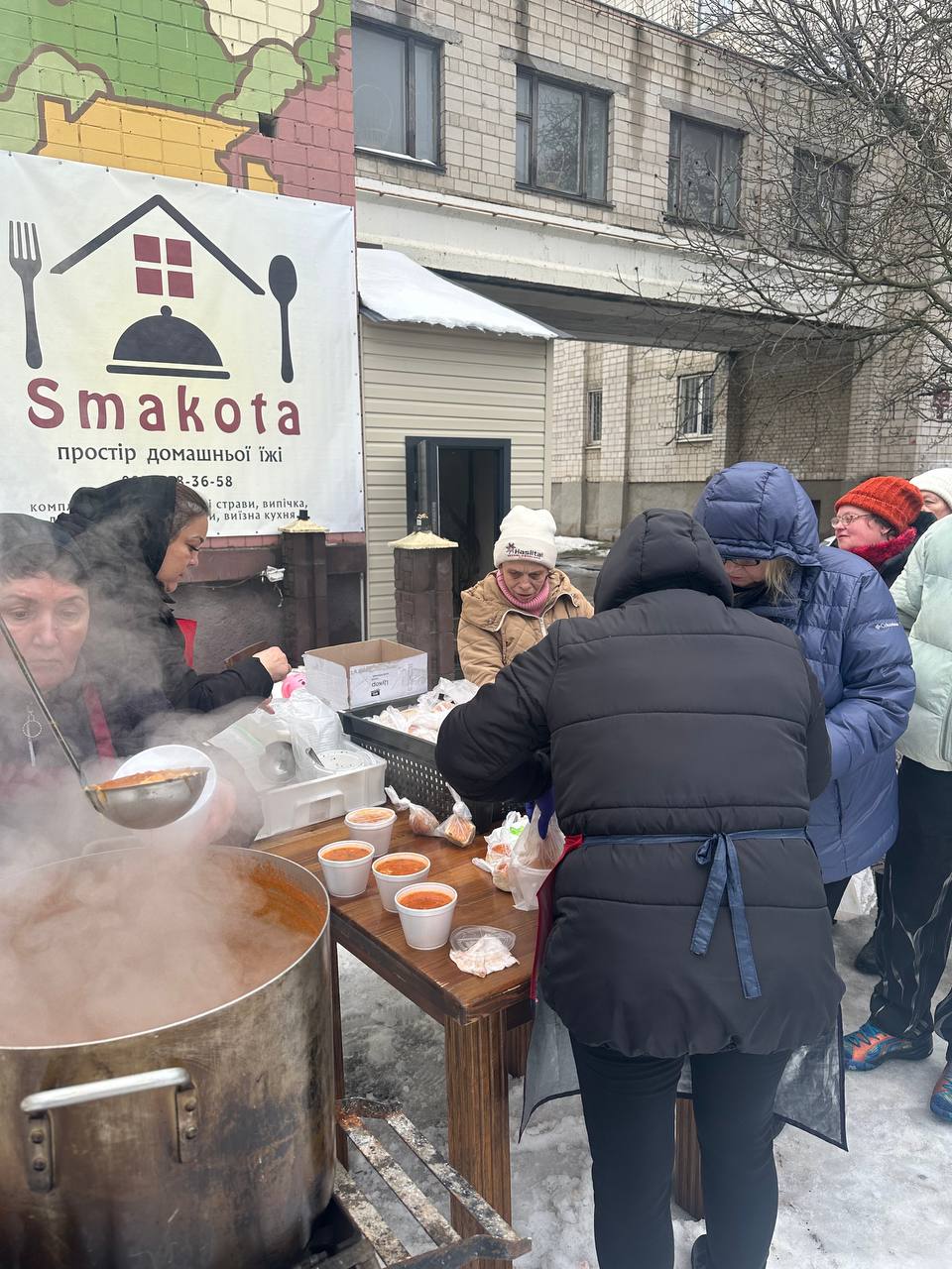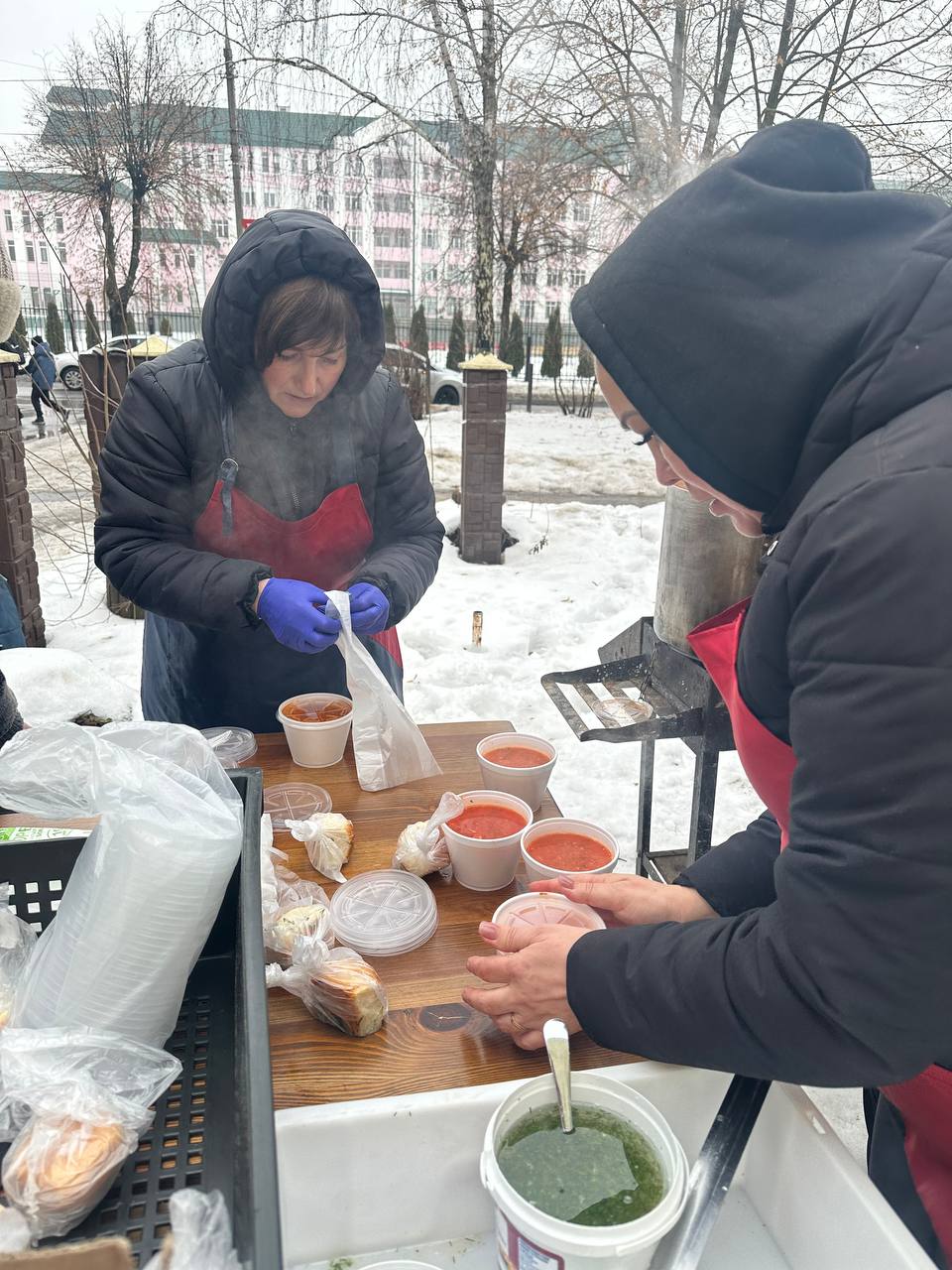 — Зазвичай варимо щосуботи, — говорить вінничанка. — Минулої суботи не змогли — я захворіла. Але вже з п’ятниці, 13 лютого, знову готуємо борщ. Будуть і пампушки, і маленькі валентинки — це буде сюрприз для людей, коли прийдуть отримувати пакунки.
