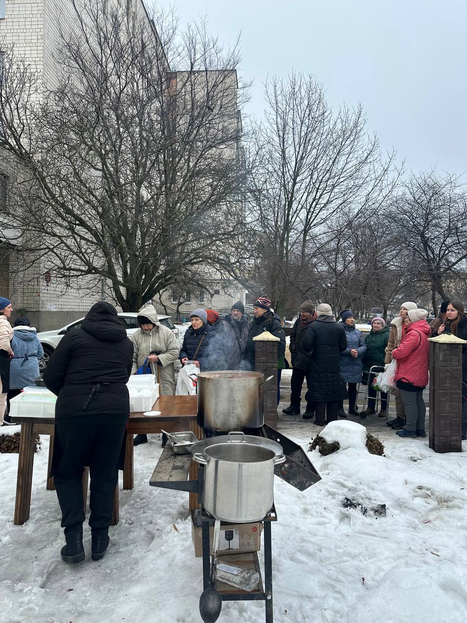 До імпровізованого пункту з борщем підходять мешканці сусідніх будинків. Кажуть, уже кілька днів самі не готували перших страв.