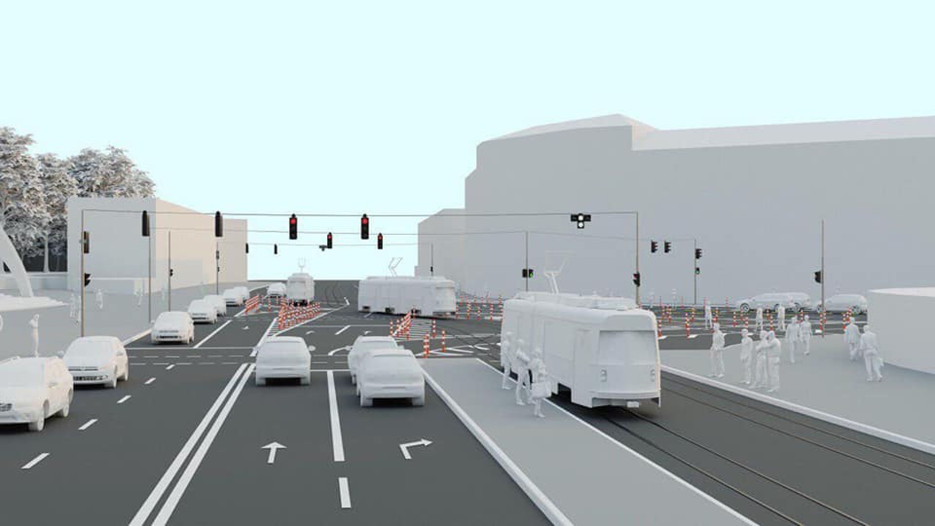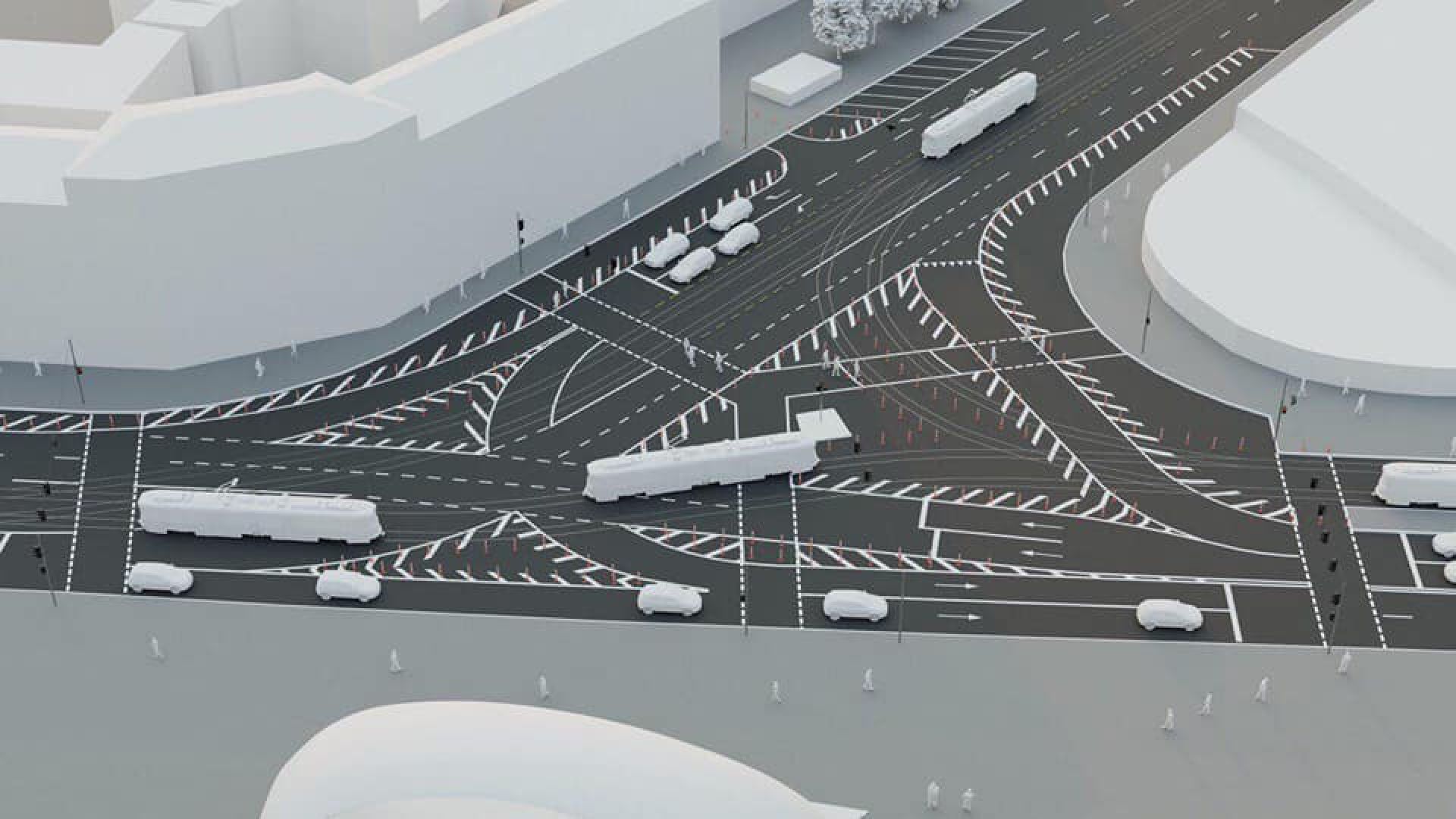 Тому обрали за основу варіант зі світлофорами, які будуть стояти на кожному напрямку — 10 для транспорту, 10 для пішоходів й три для трамваїв.
