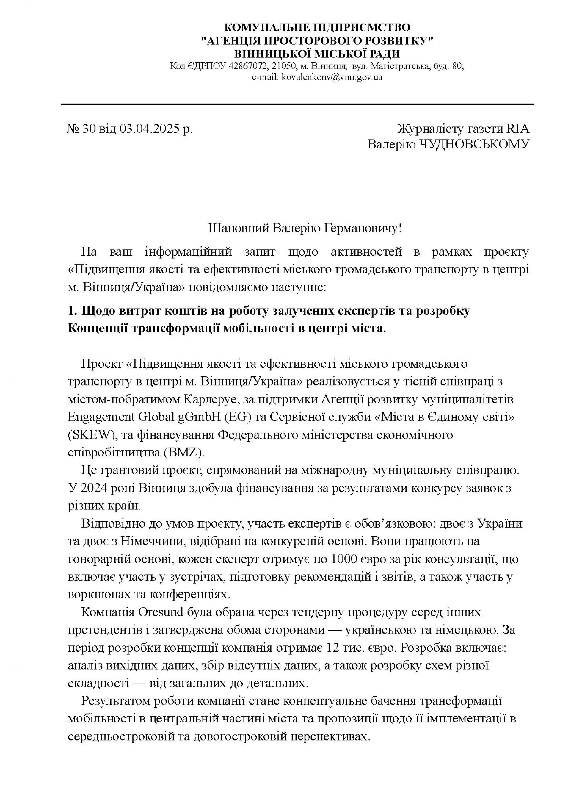 Через конкурс також обирали експертів, які допомагатимуть Вінниці із розробкою плану змін. Це двоє людей з України, двоє з Німеччини. Від української сторони була обрана компанія Oresund, що за свою роботу отримає 12 тисяч євро.