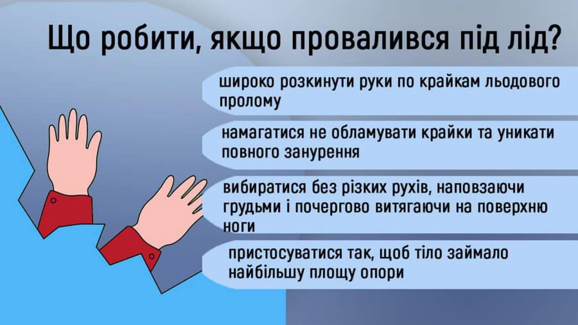 — Вийшовши на лід, кожна людина повинна бути готова до екстреної ситуації. І не важливо, що ви вклали собі в голову думку, що все буде добре. При раптовій, непередбачуваній ситуації, людина не підіймається до рівня свого очікування, а опускається до рівня своїх знань та навичок. Тому приділіть декілька хвилин свого часу і хоча б прочитайте два рази даний текст, — зазначають у повідомленні. — Розглянемо два можливі варіанти: Ви провалилися під лід і Ви помітили, як хтось потрапив у цю ж халепу.