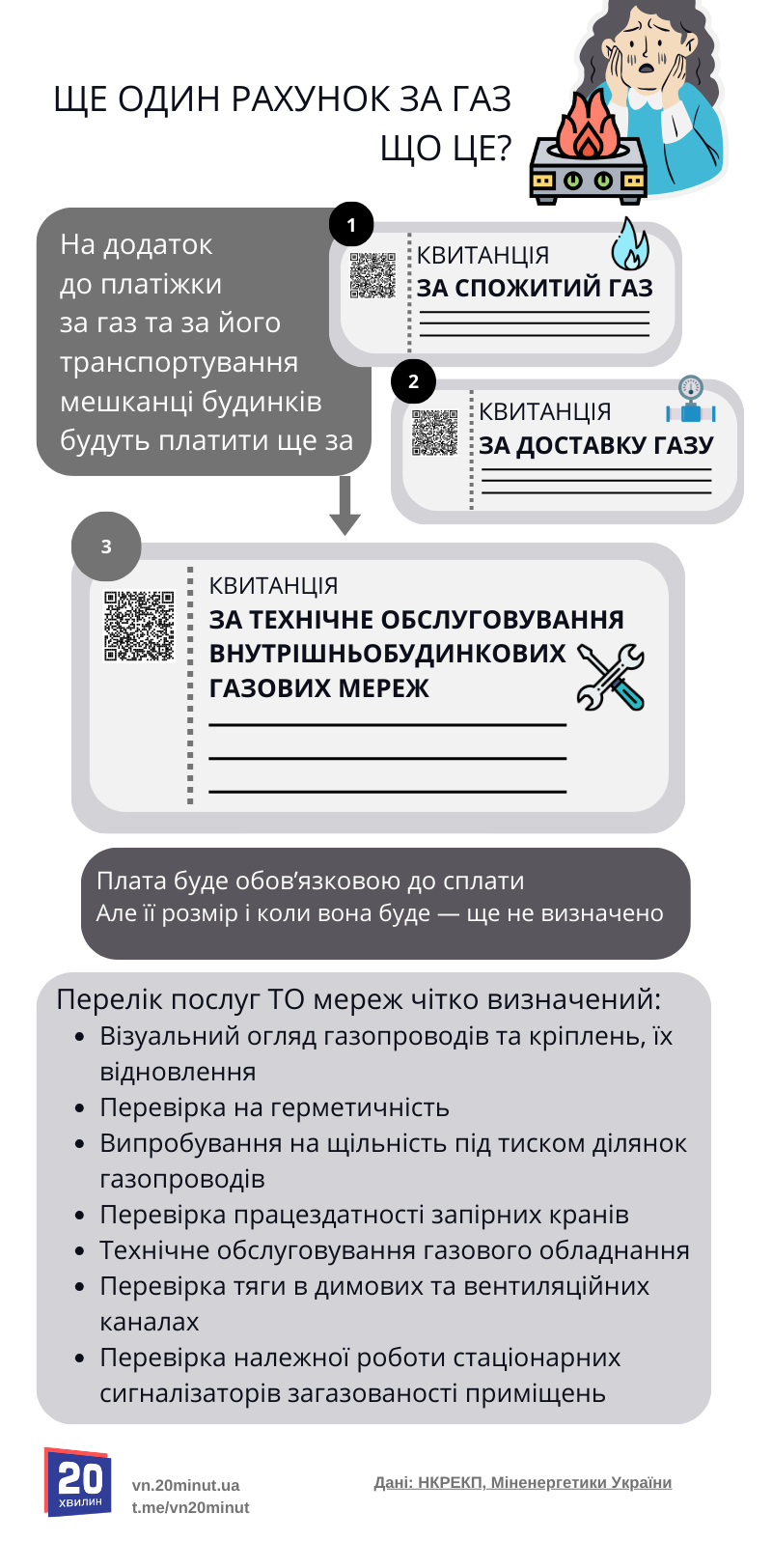 Днями у ЗМІ та телеграм-каналах почали поширювати інформацію, що українцям виставлятимуть ще одну платіжку за газ. Крім плати за доставку, плати за спожите можуть з’явитися квитанції з оплатою за технічне обслуговування внутрішньобудинкових газових мереж.