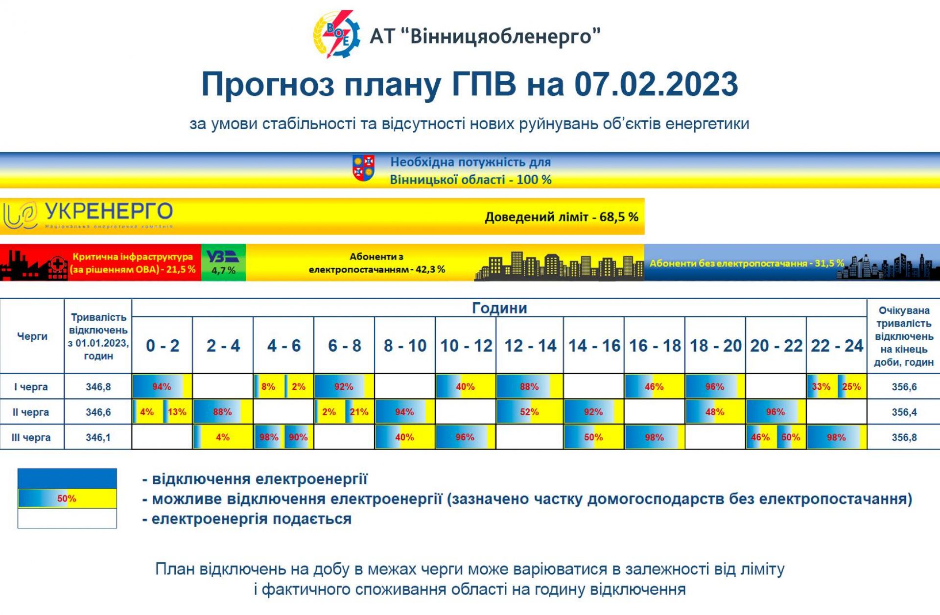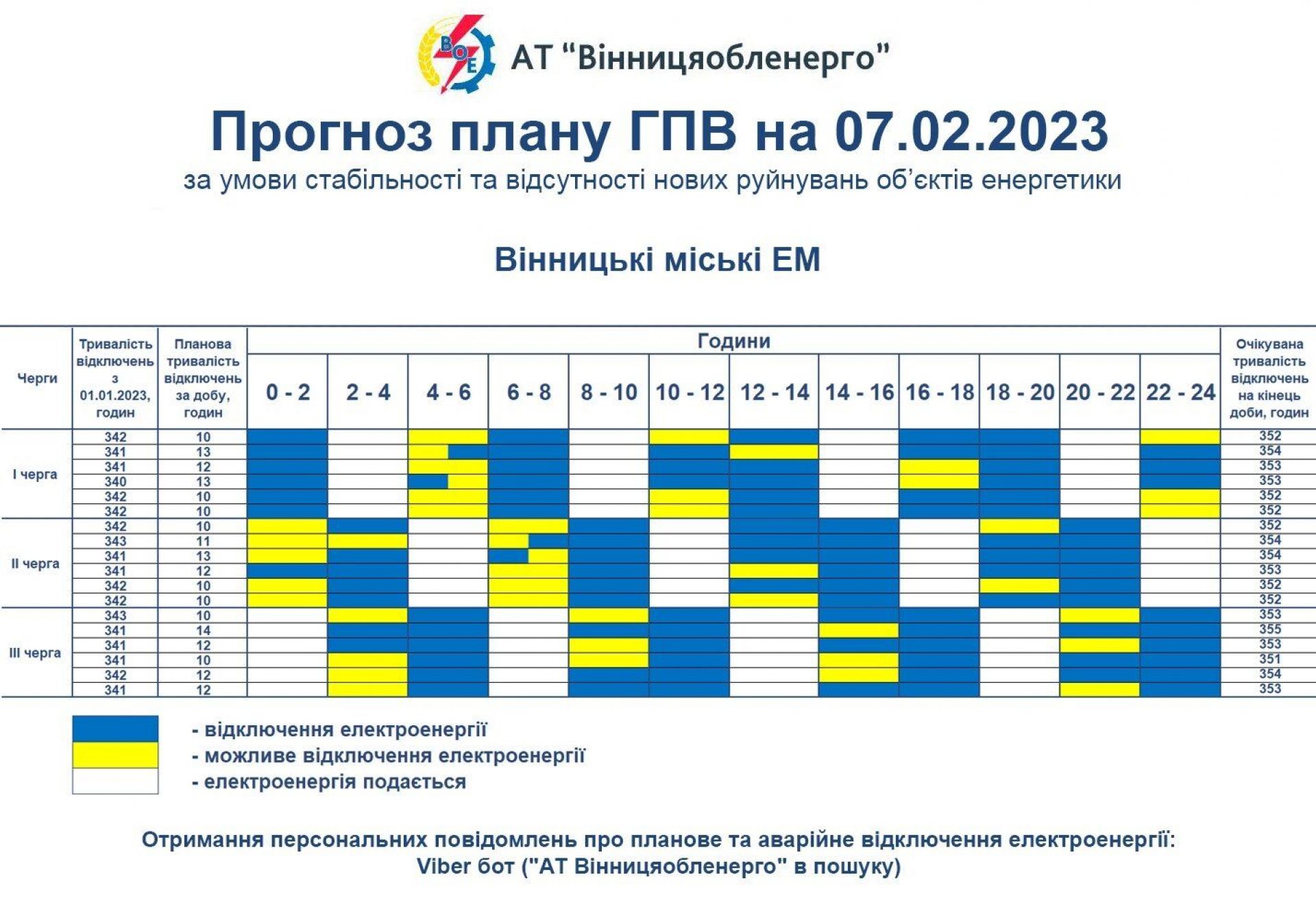 - У «Вінницяобленерго» опублікували графік погодинного знеструмлення, який діятиме протягом 7 лютого.
