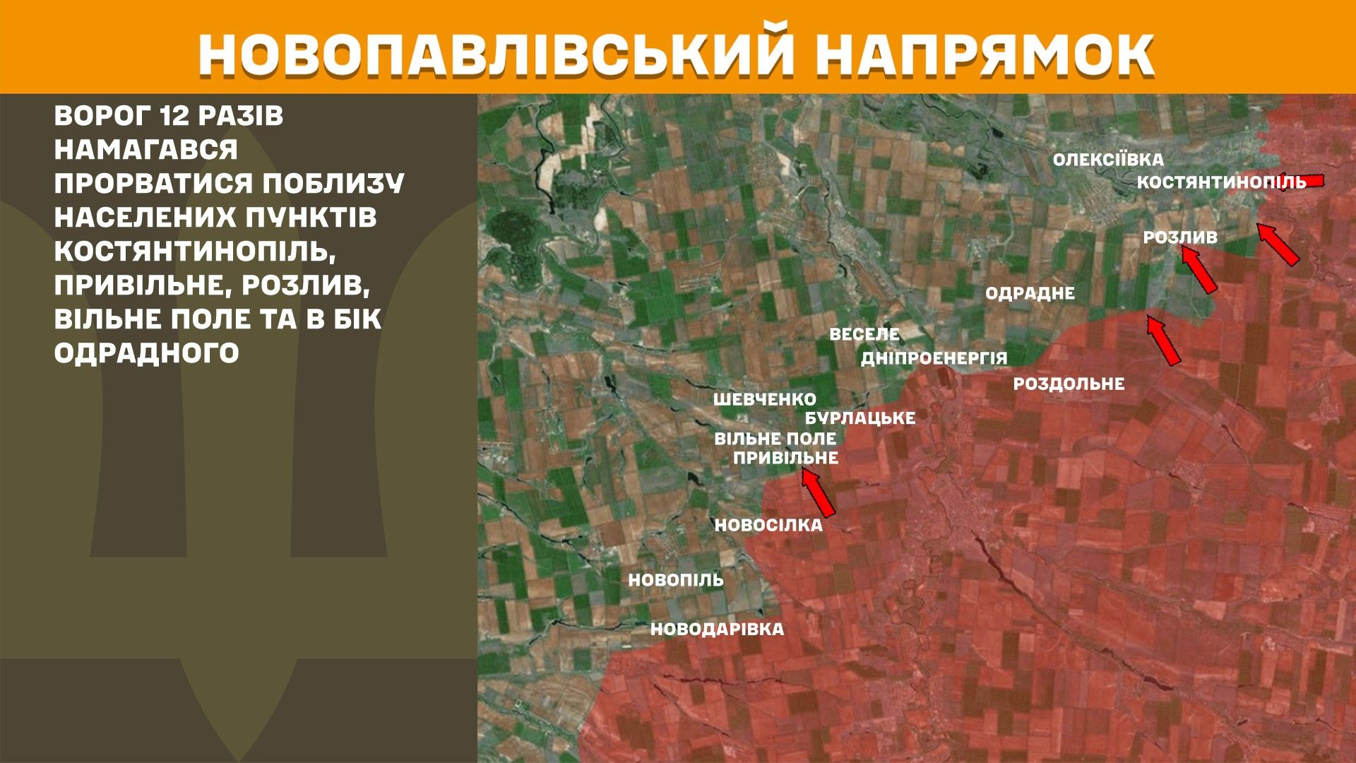 На Новопавлівському напрямку ворог 12 разів намагався прорватися поблизу населених пунктів Костянтинопіль, Привільне, Розлив, Вільне Поле та в бік Одрадного.